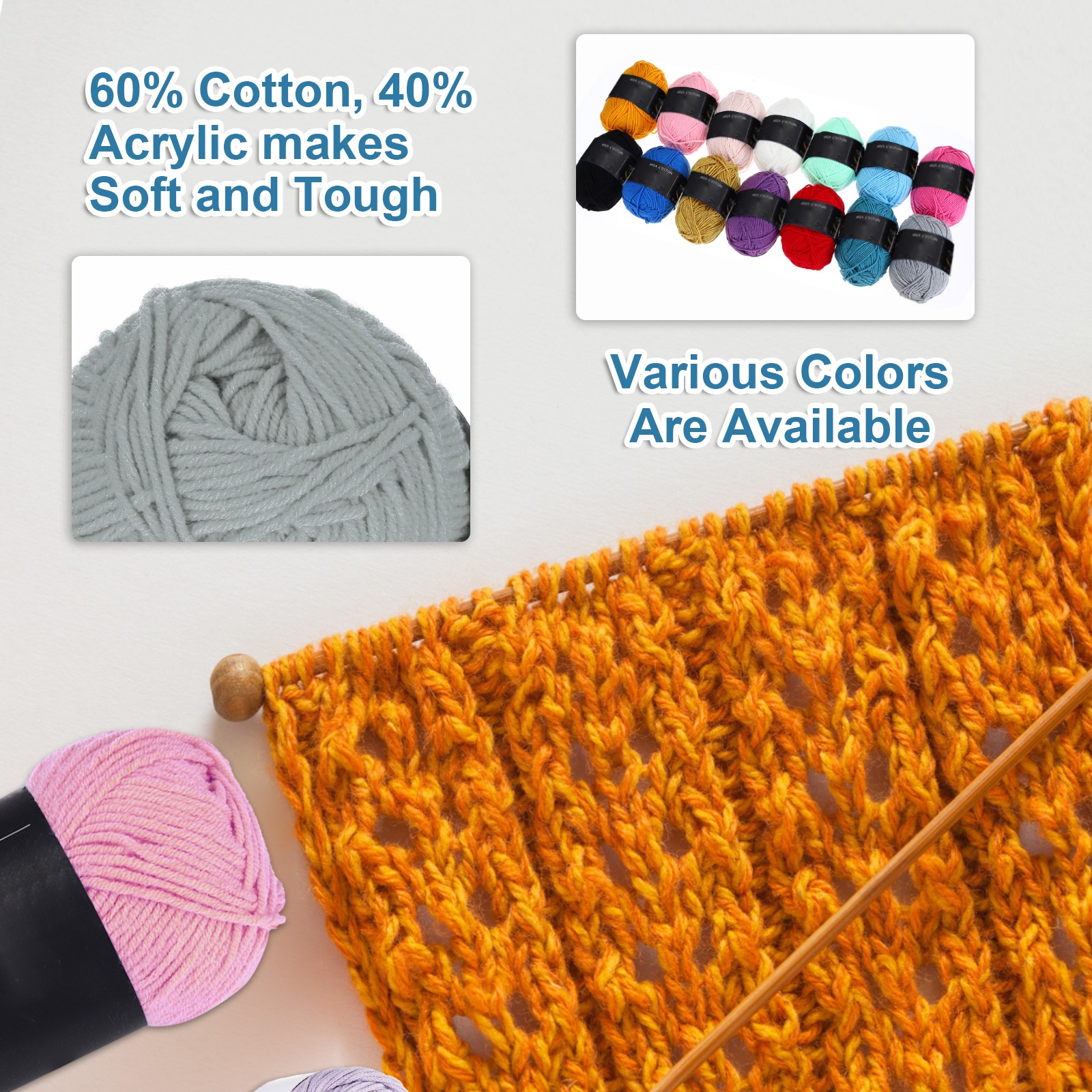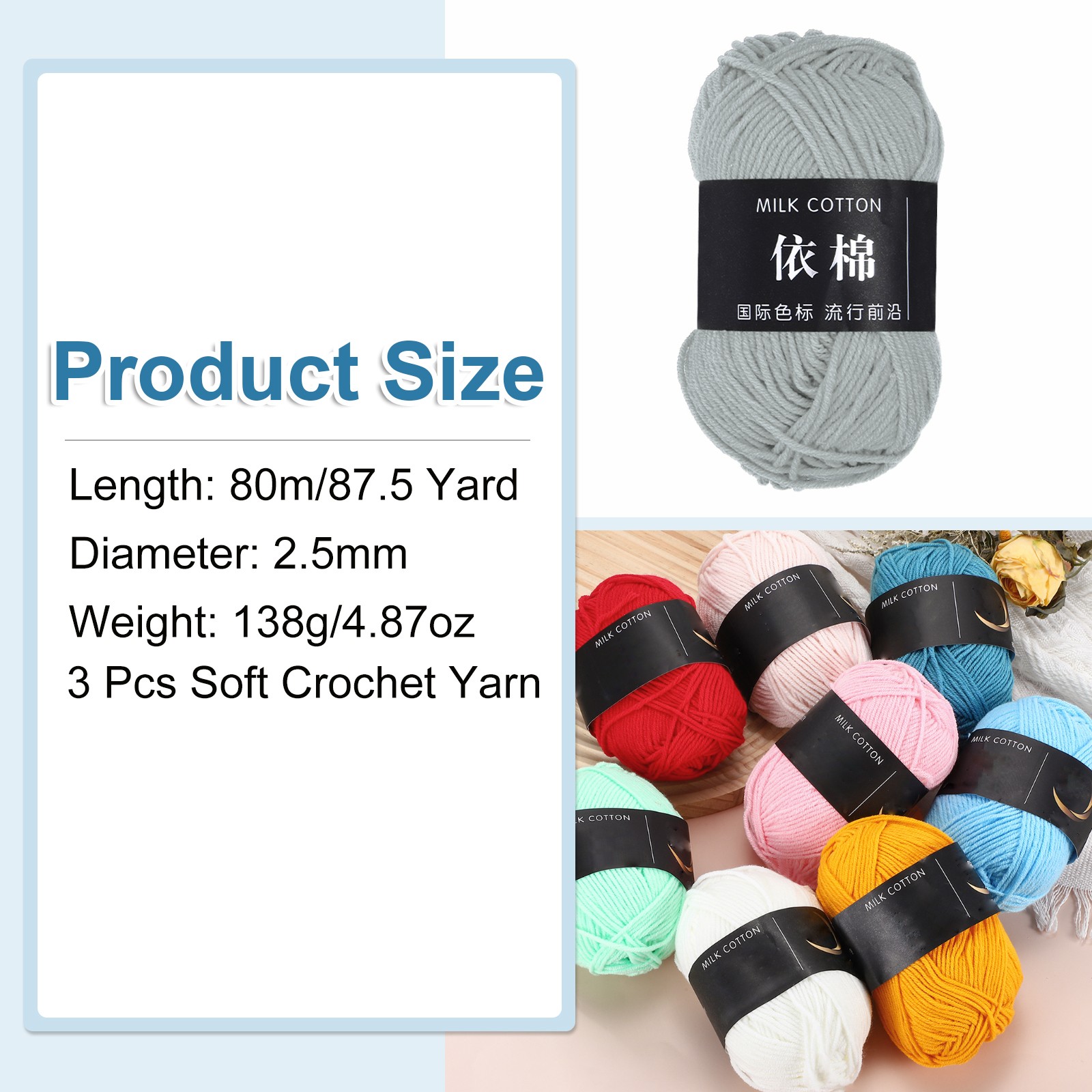 3Pcs Cotton Yarn Knitting Yarn Crochet Yarn 87.5Yard x 2.5mm, Light Gray