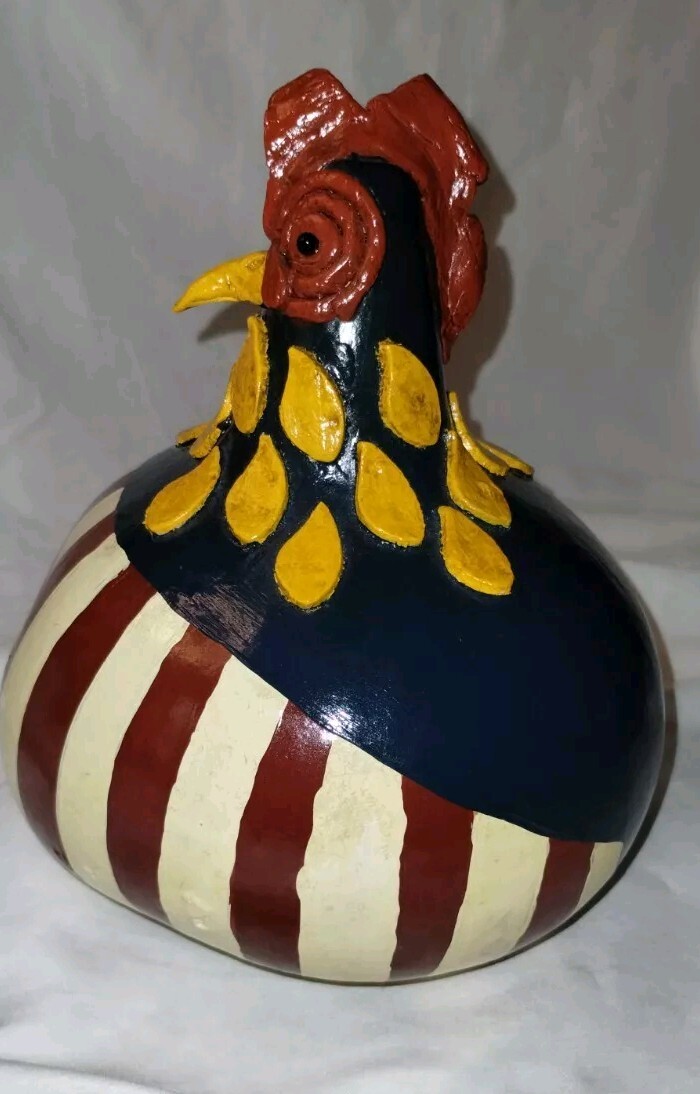 Patriotic Rooster Gourd, Hand Painted Primitive Folk Art, Artist Signed, 9 Tall