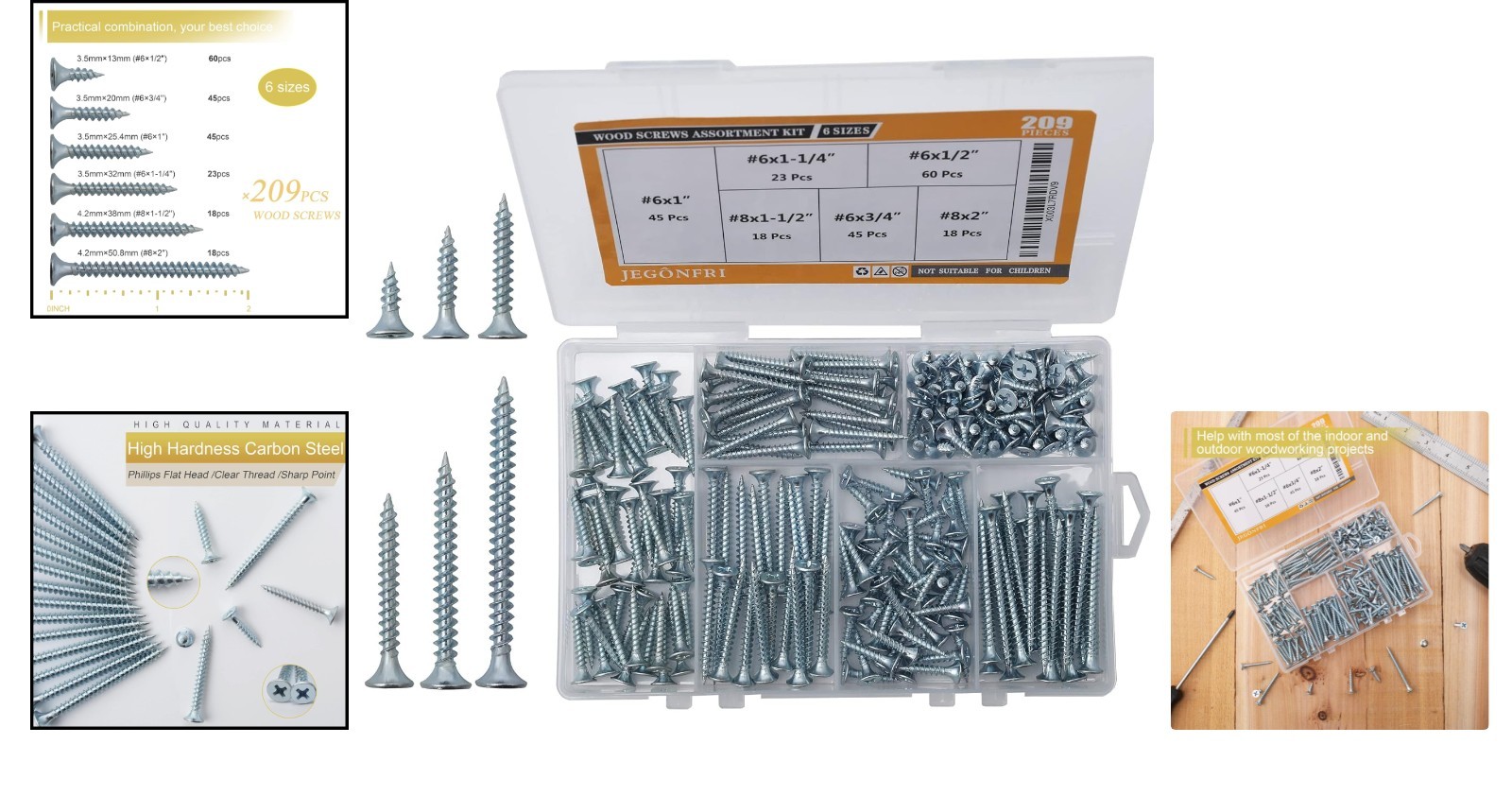 • High Hardness Wood Screws Set: 209 Assorted Phillips Drive Sizes Durability