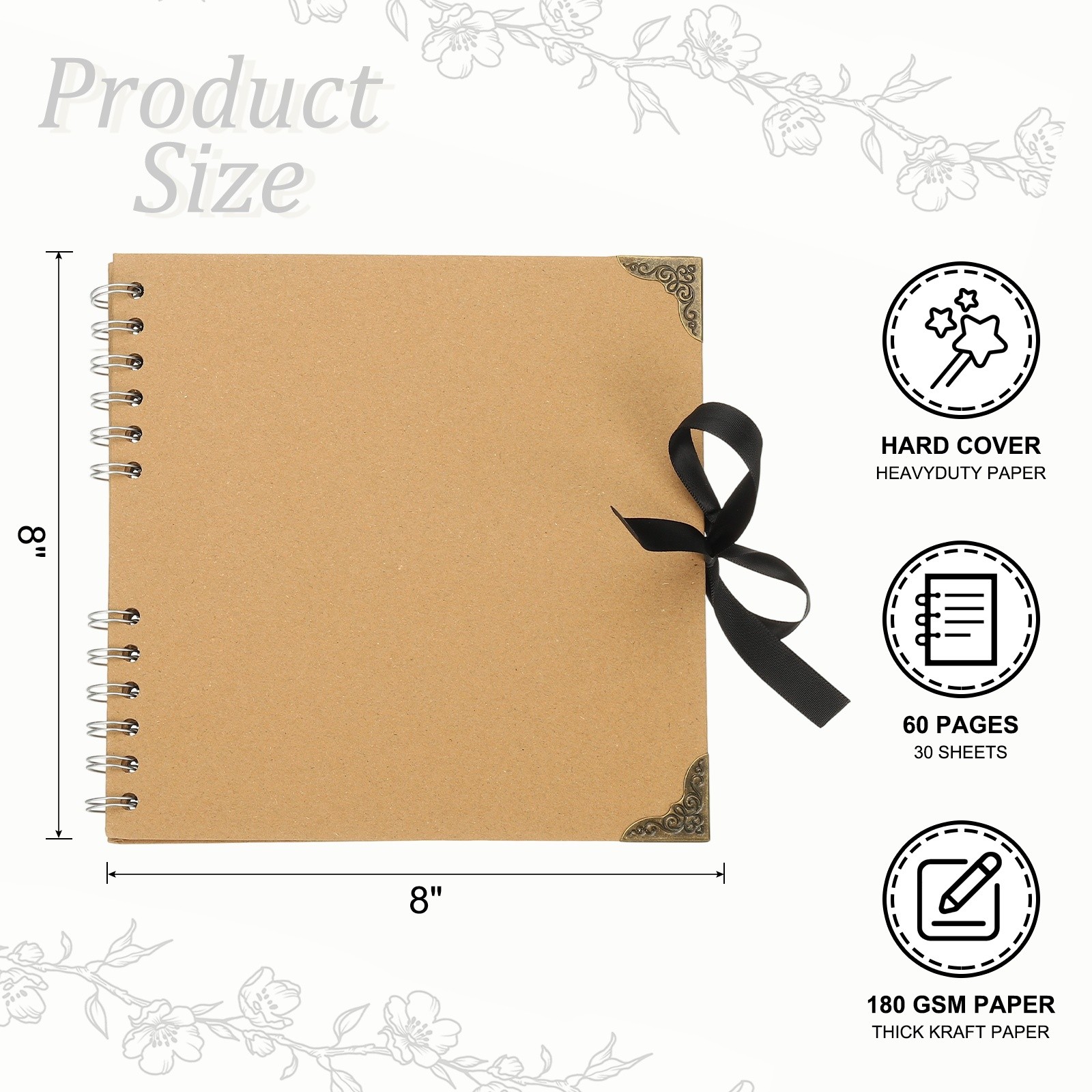 Scrapbook Photo Albums, 8x8 Inch 60 Pages with Ribbon Protector, Khaki, 1 Pcs