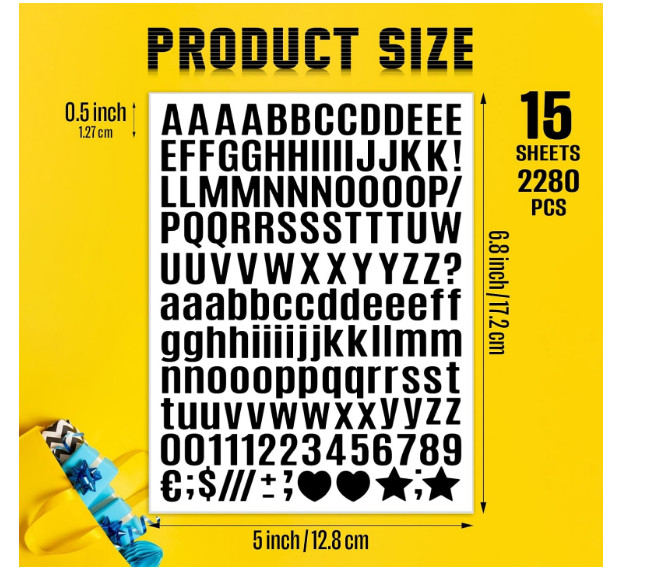 15 Sheet Small Letter Stickers - 1/2 Inch Black Vinyl Self Adhesive Alphabet Num