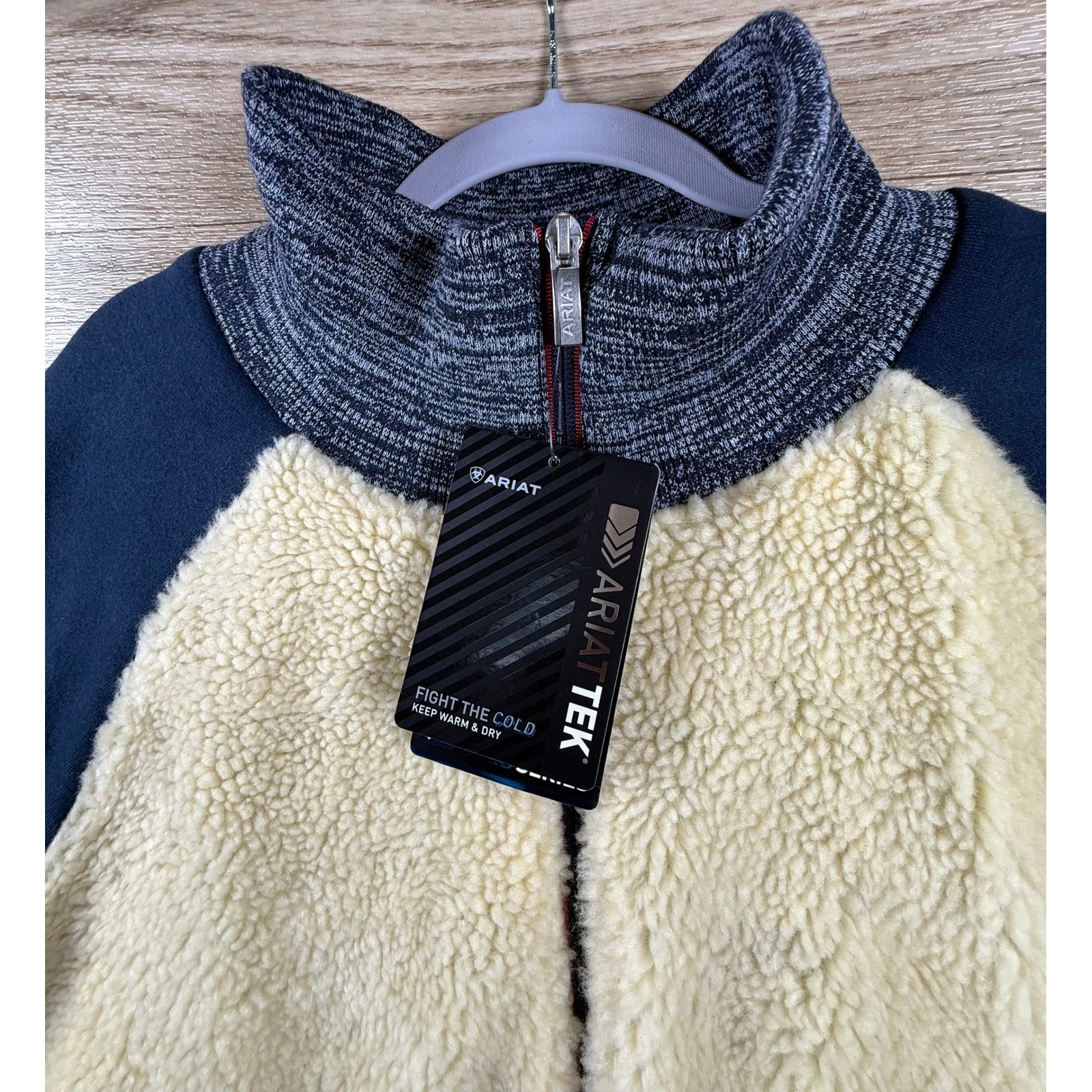 как выглядит Ariat TEK Sherpa Fleece Jacket Navy Cream Women L Sherpa Cowboy Ranch Core фото