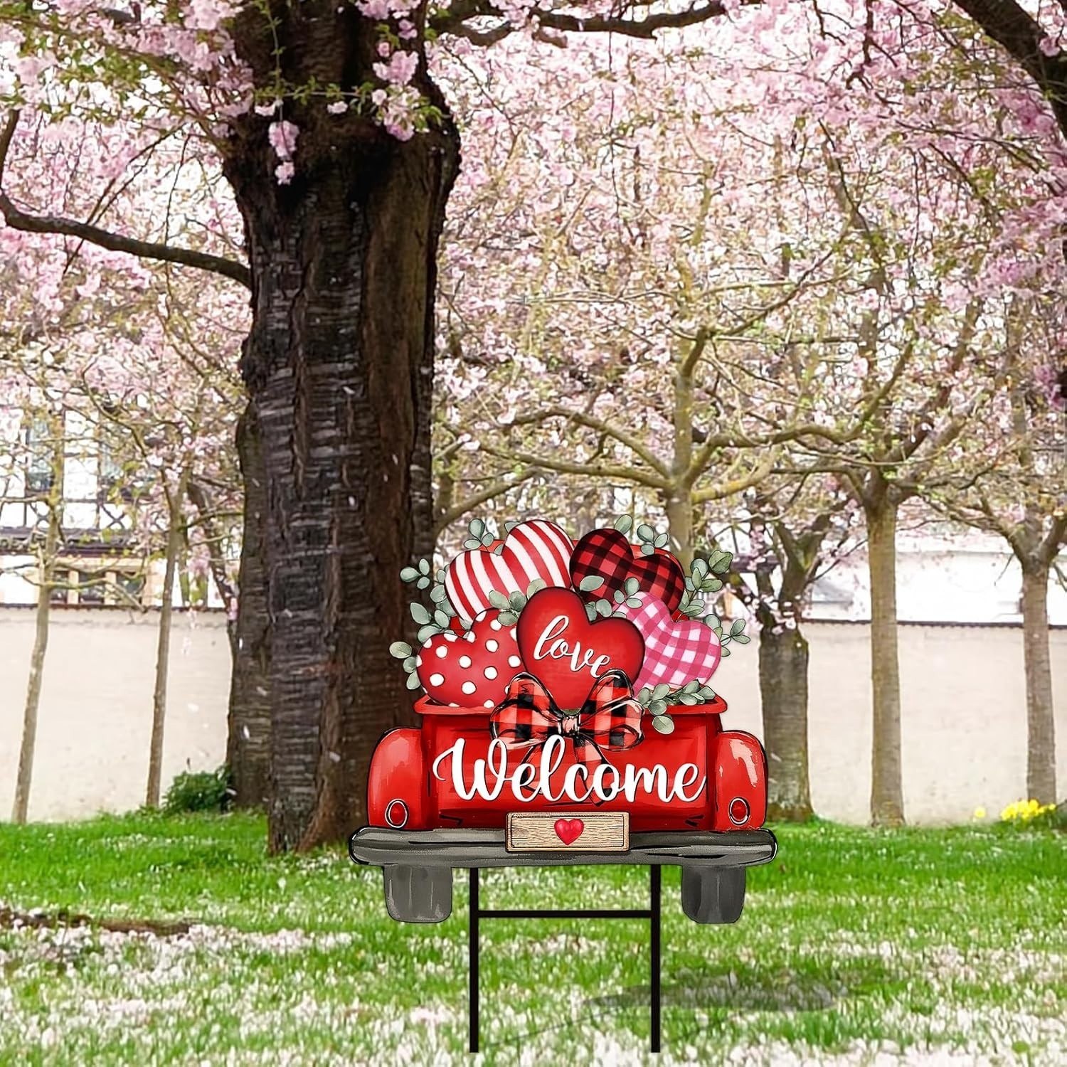 Valentine' s Day Metal Garden Stake Welcome Yard Sign Red Love Heart Truck De...