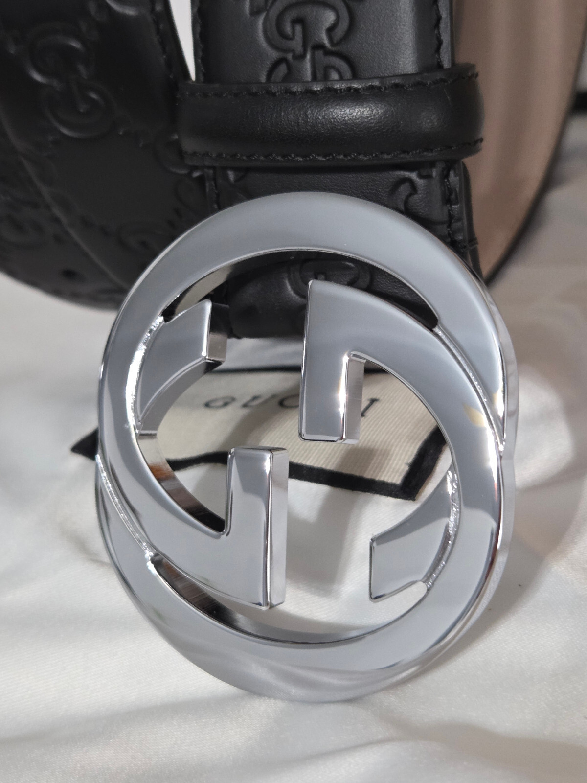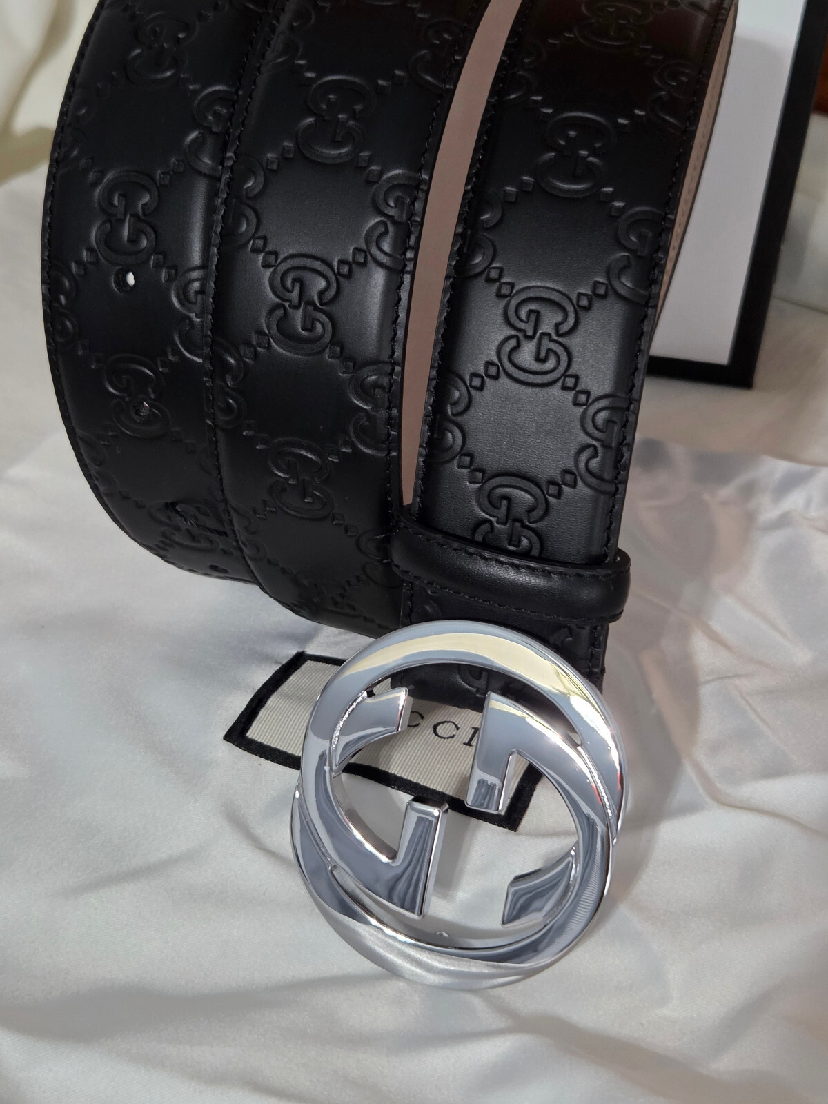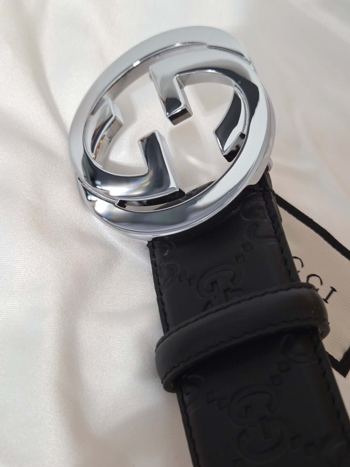 как выглядит Authentic Black Leather Gucci Belt Silver GG Buckle Size 34-36 100cm фото