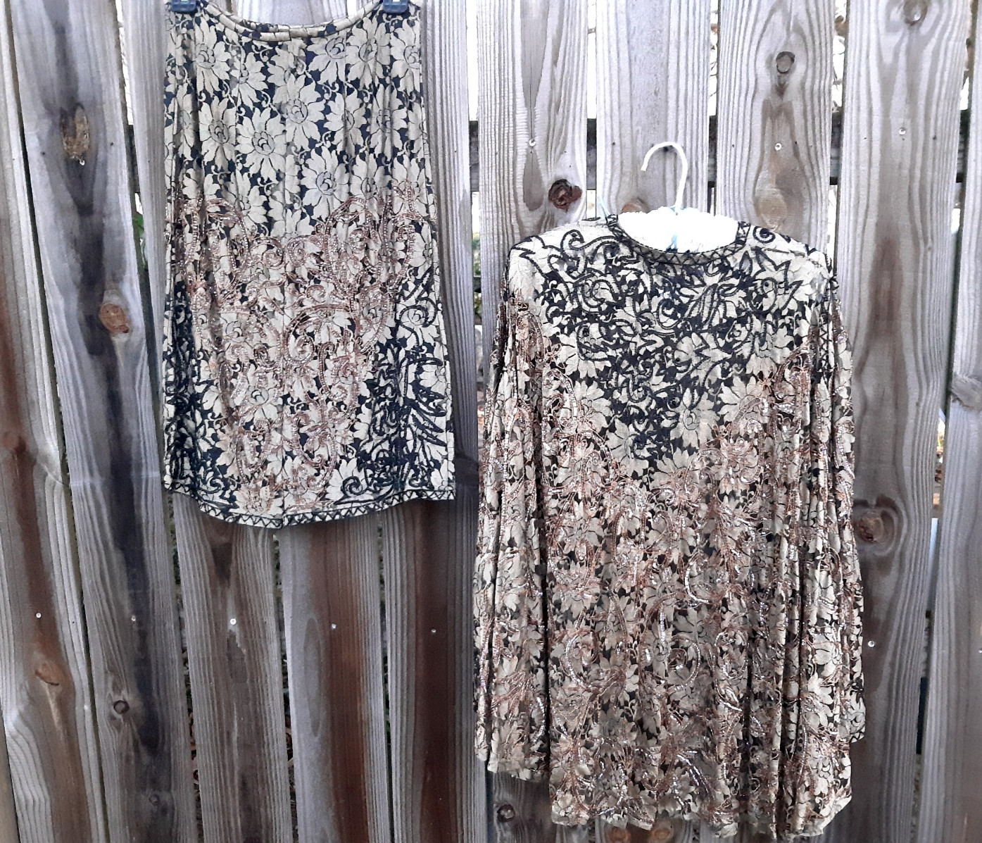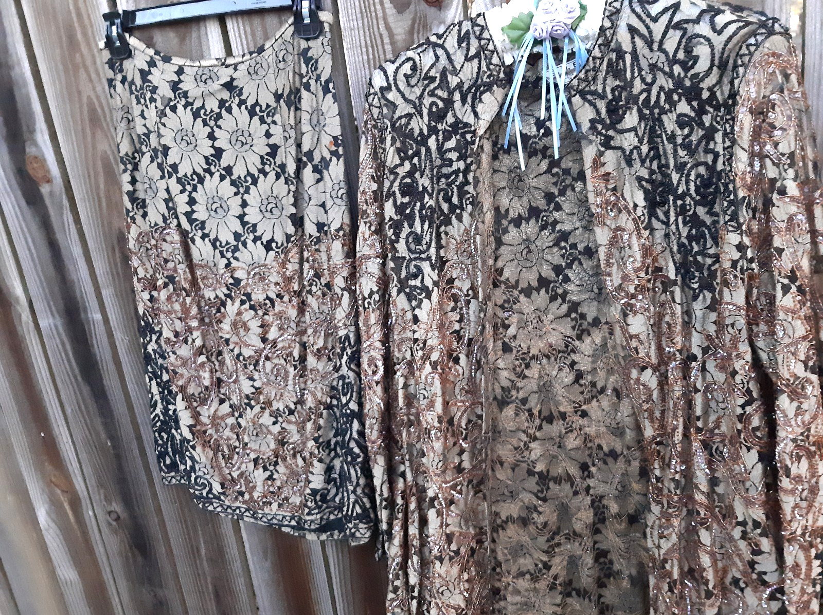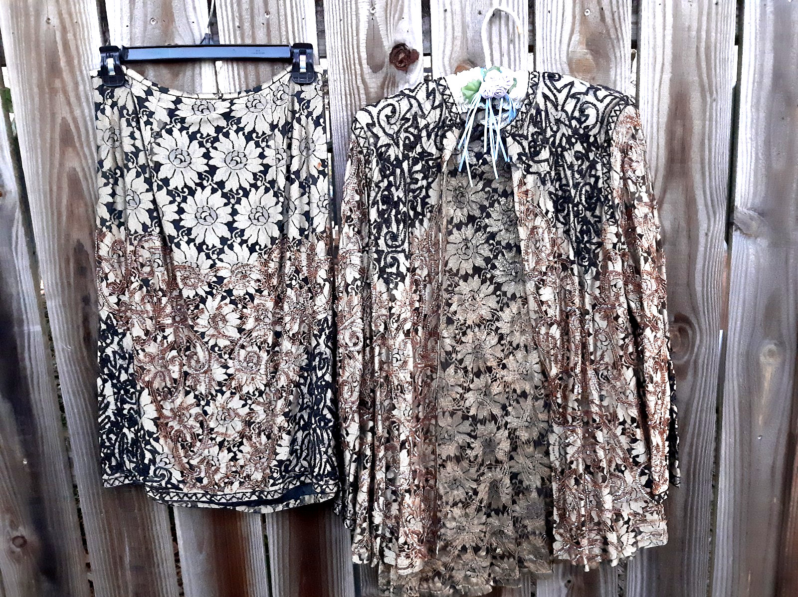 как выглядит Vintage S.H.E. Silk Lace Overlay Beaded Jacket Skirt Suit Set M Black , Gold фото
