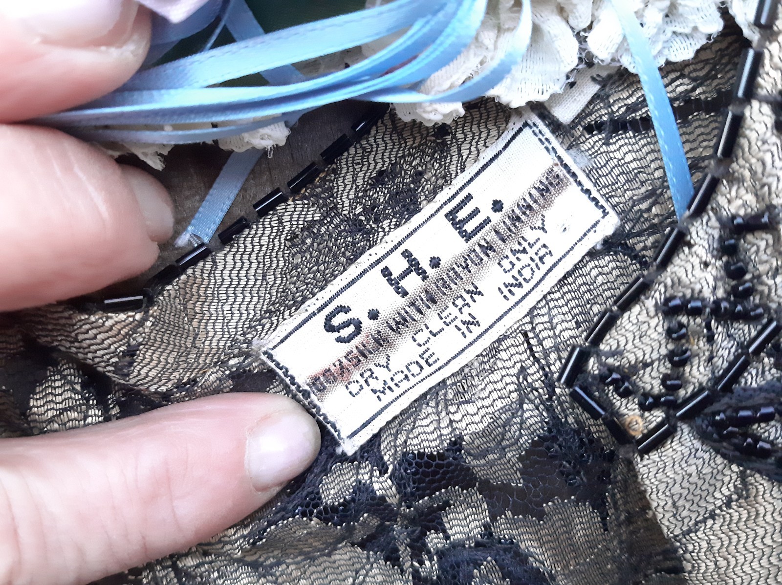 Vintage S.H.E. Silk Lace Overlay Beaded Jacket Skirt Suit Set M Black , Gold