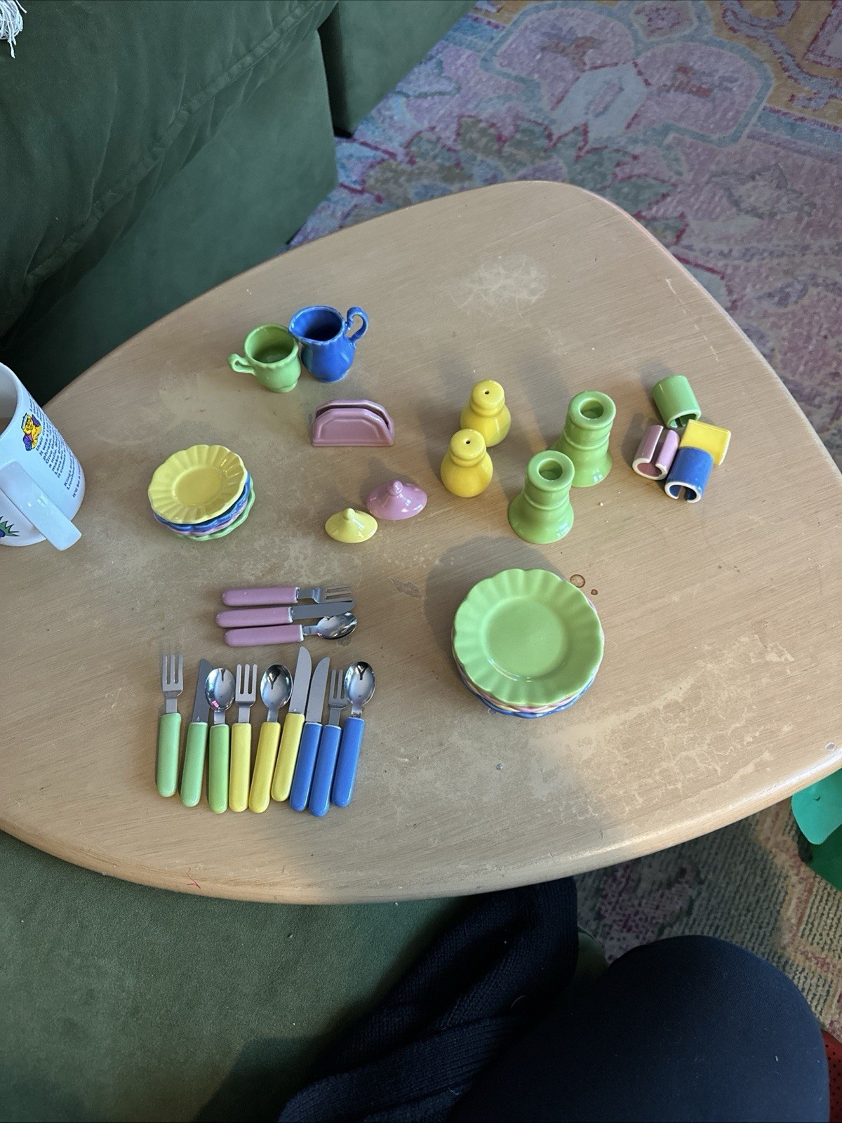 Vintage 33 FRENZY TOYS Pastel Fiesta Colors Ceramic Child's Tea Set