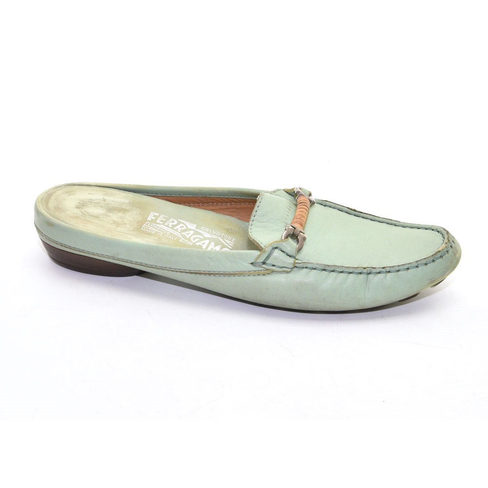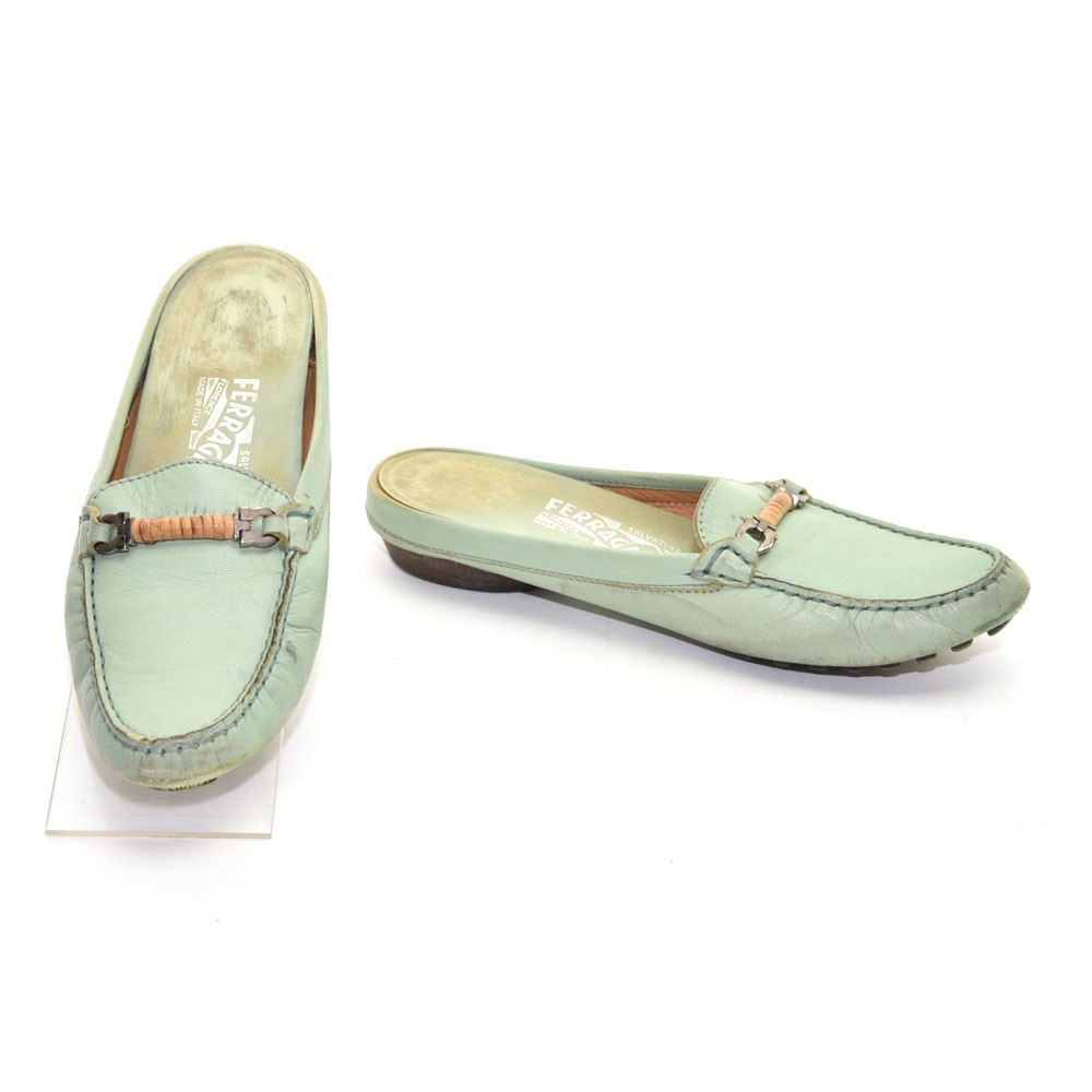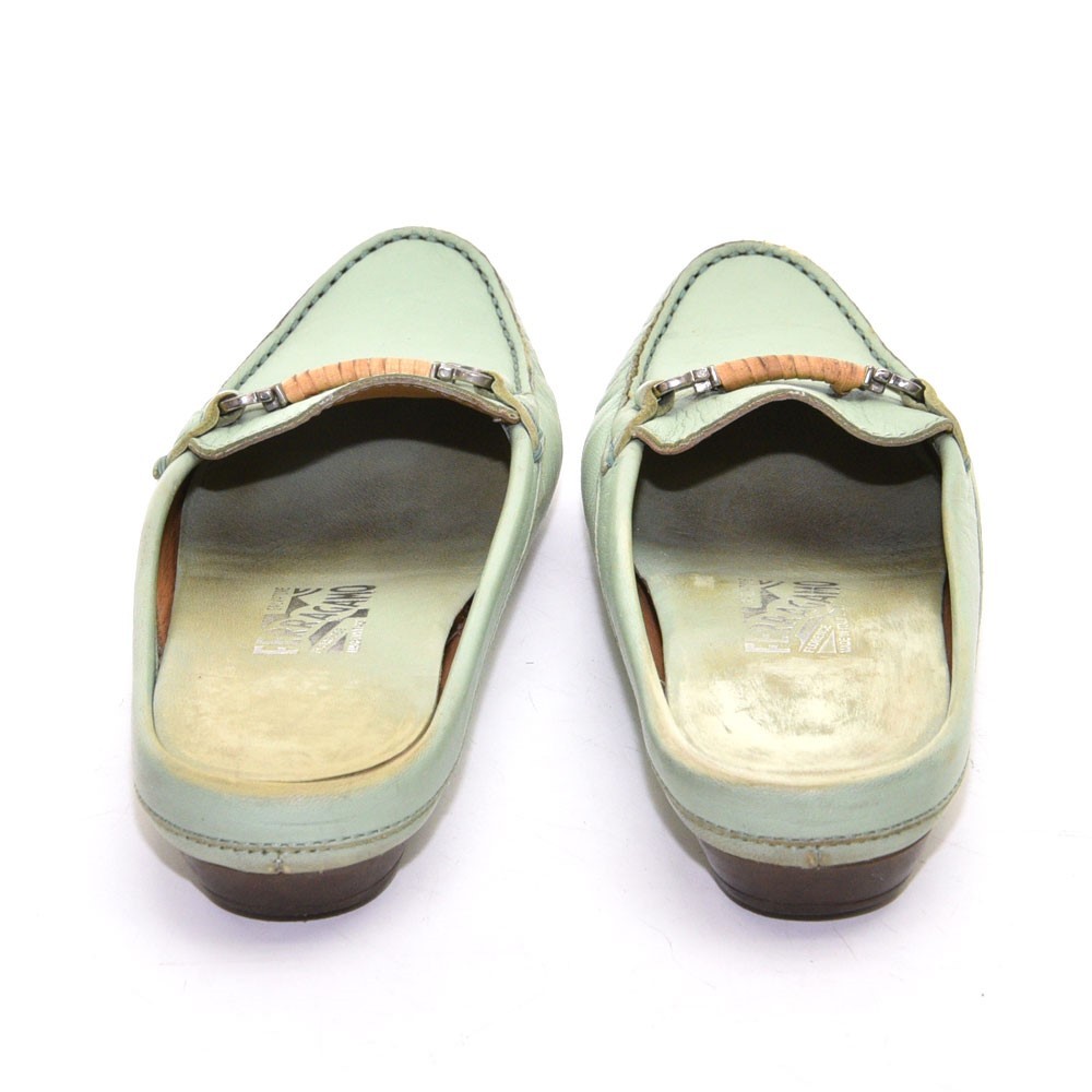 Ladies Salvatore Ferragamo Arema Gancini Pin Mules 6 B Green Leather Slip Shoes