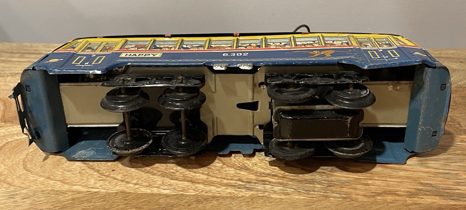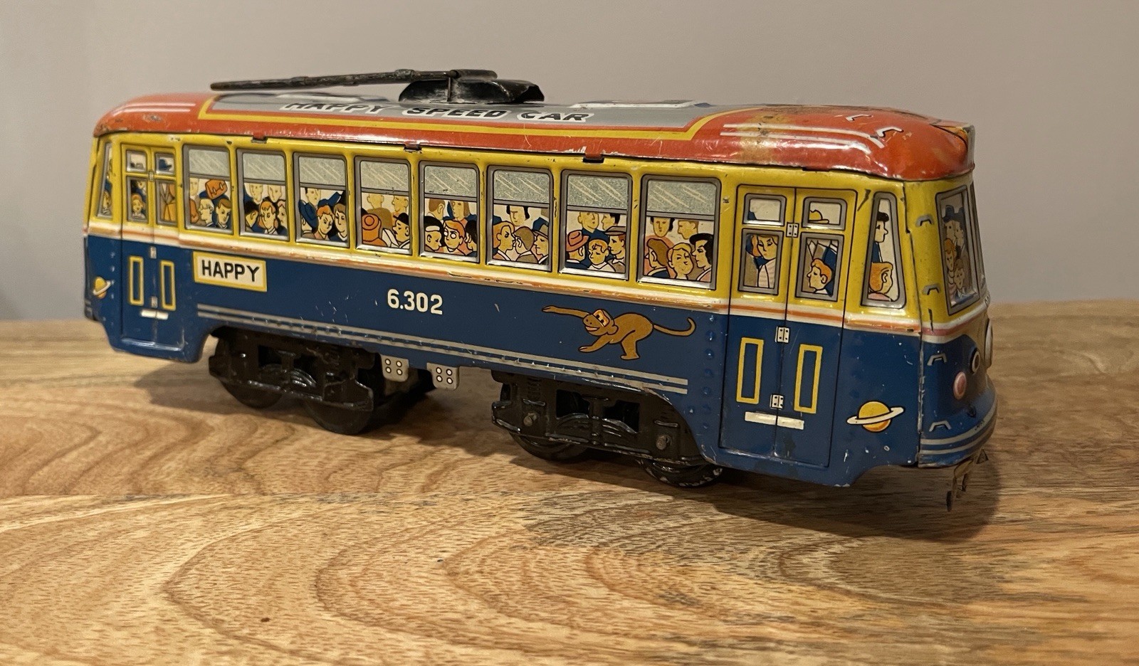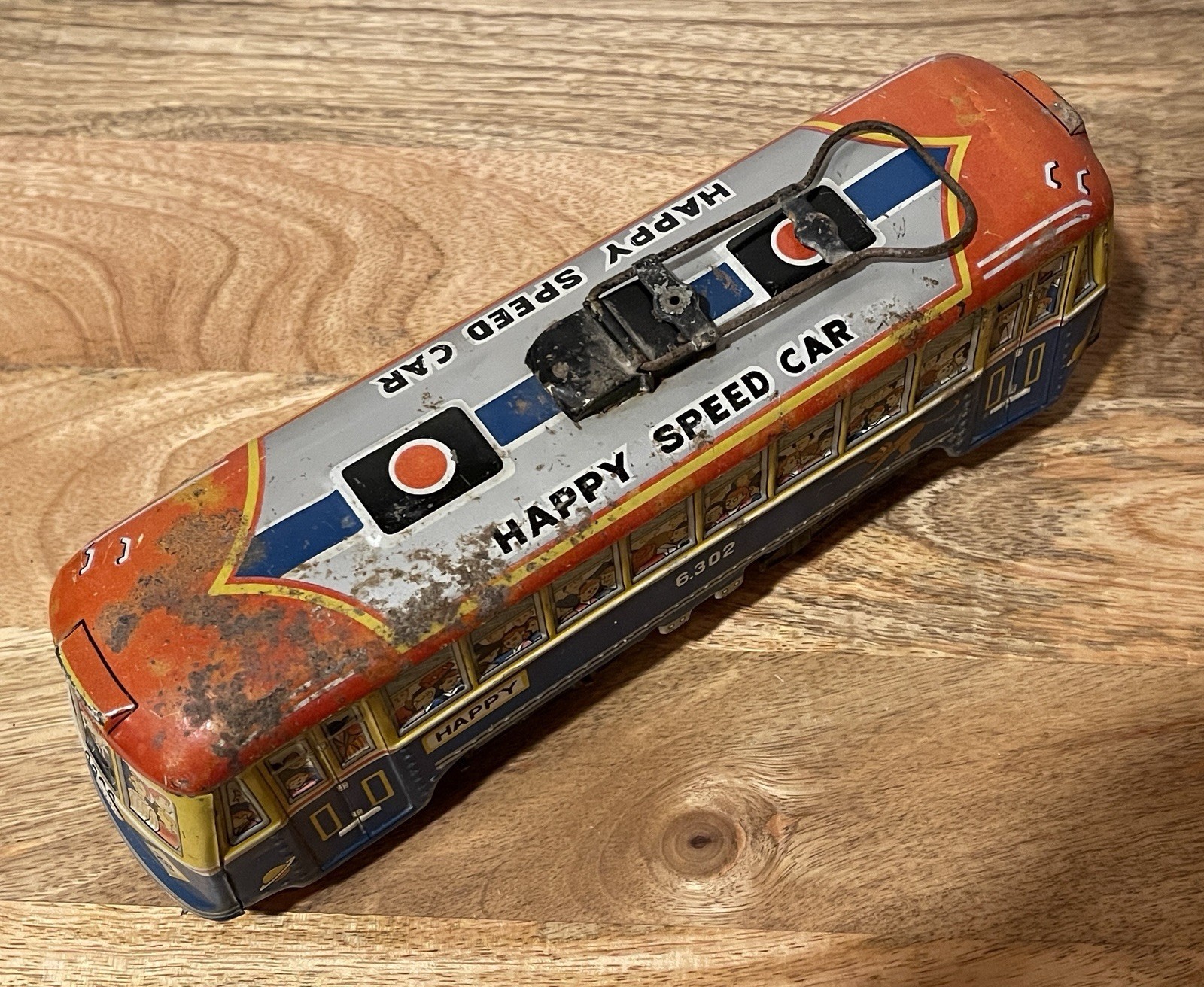 Vintage Tin Litho Friction Toy Trolley Bus Happy Speed Car Hadson Japan.