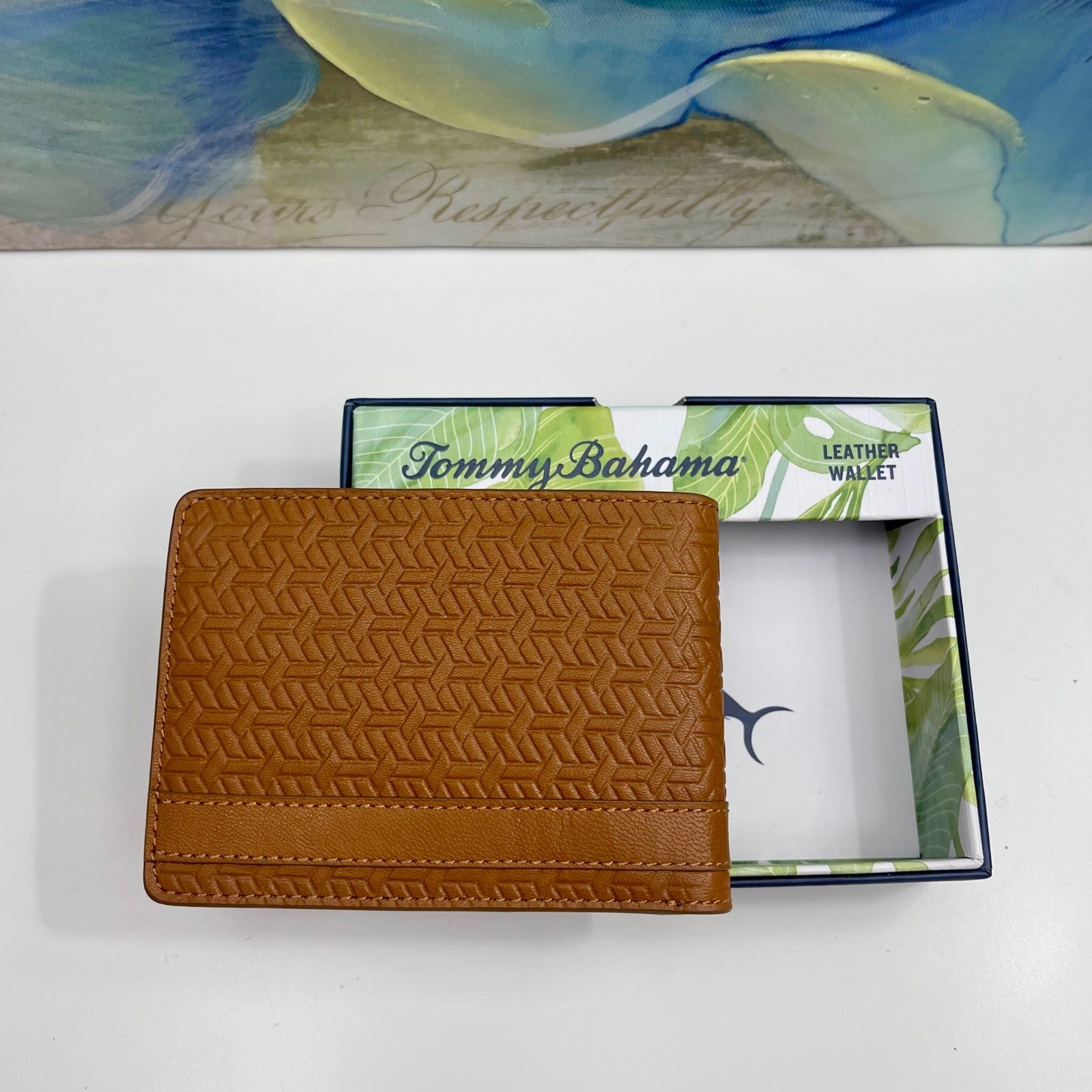 Tommy Bahama Mens Tan Leather Geometric Embossed BiFold Wallet With Box
