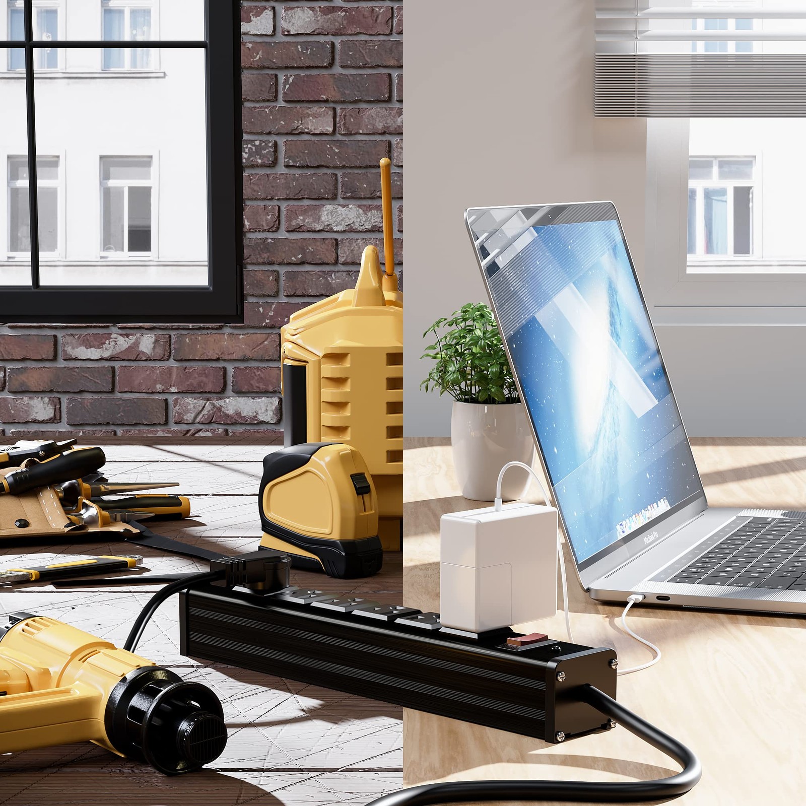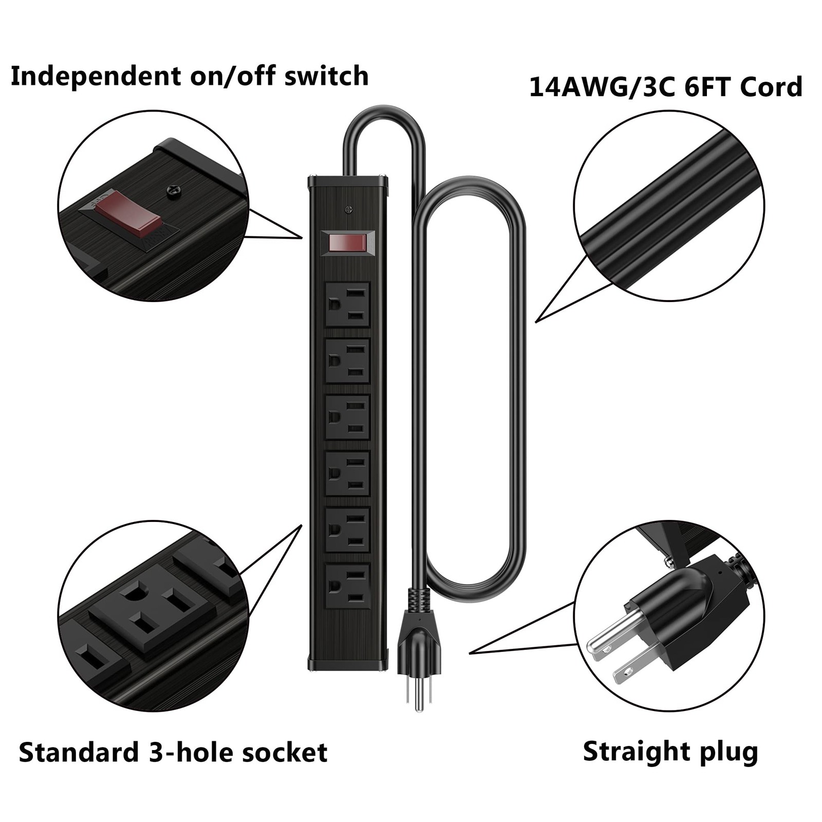 Metal Socket Wall Mount 6 Outlets Heavy Duty Power Strip, 6 Feet Extension Co...