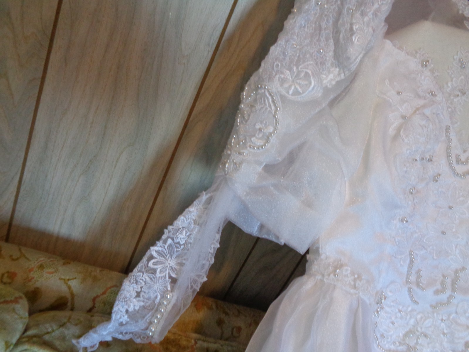 VINTAGE WHITE RUFFLE WEDDING DRESS W/RUFFLE TRAIN, SIZE 6