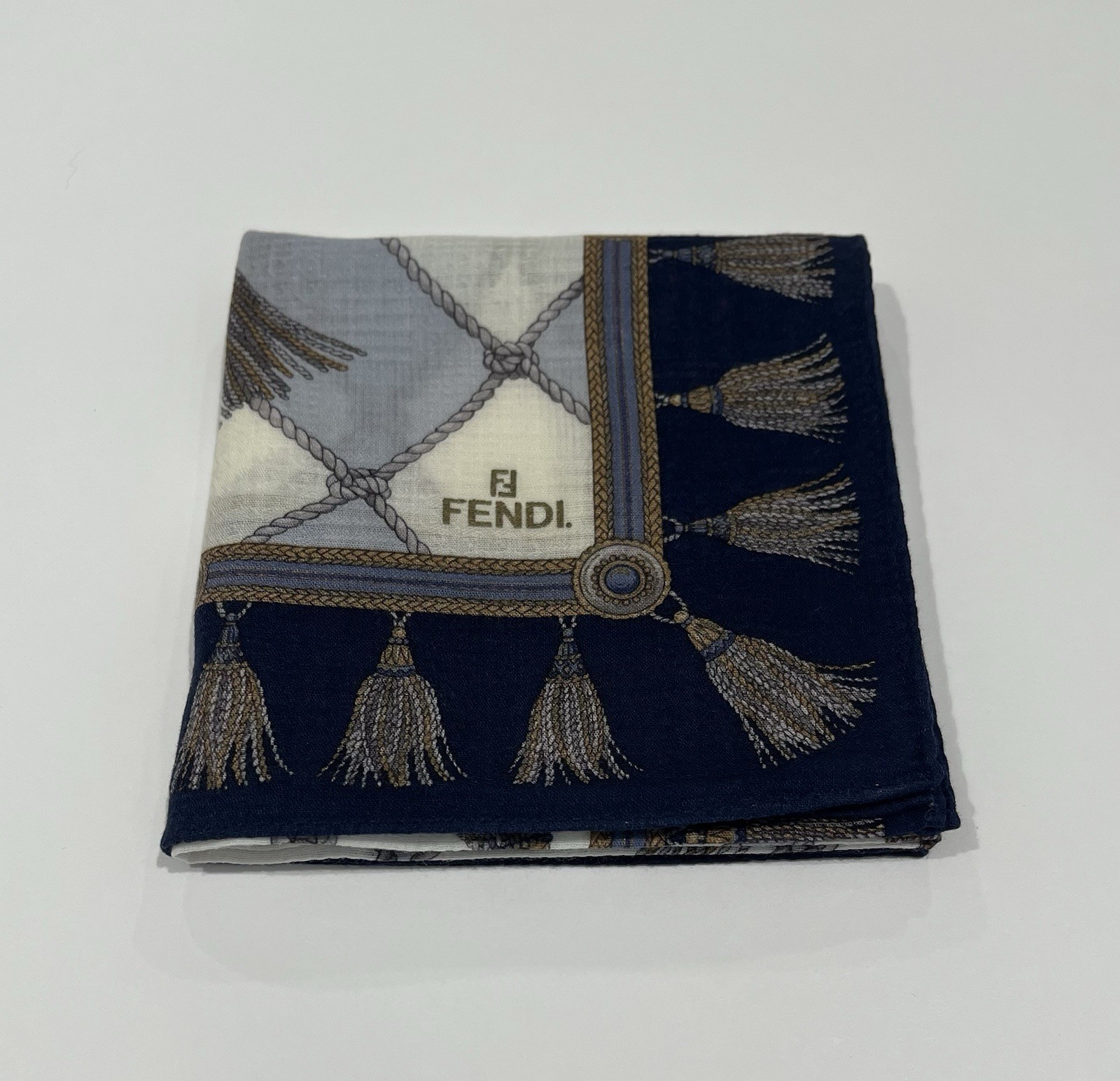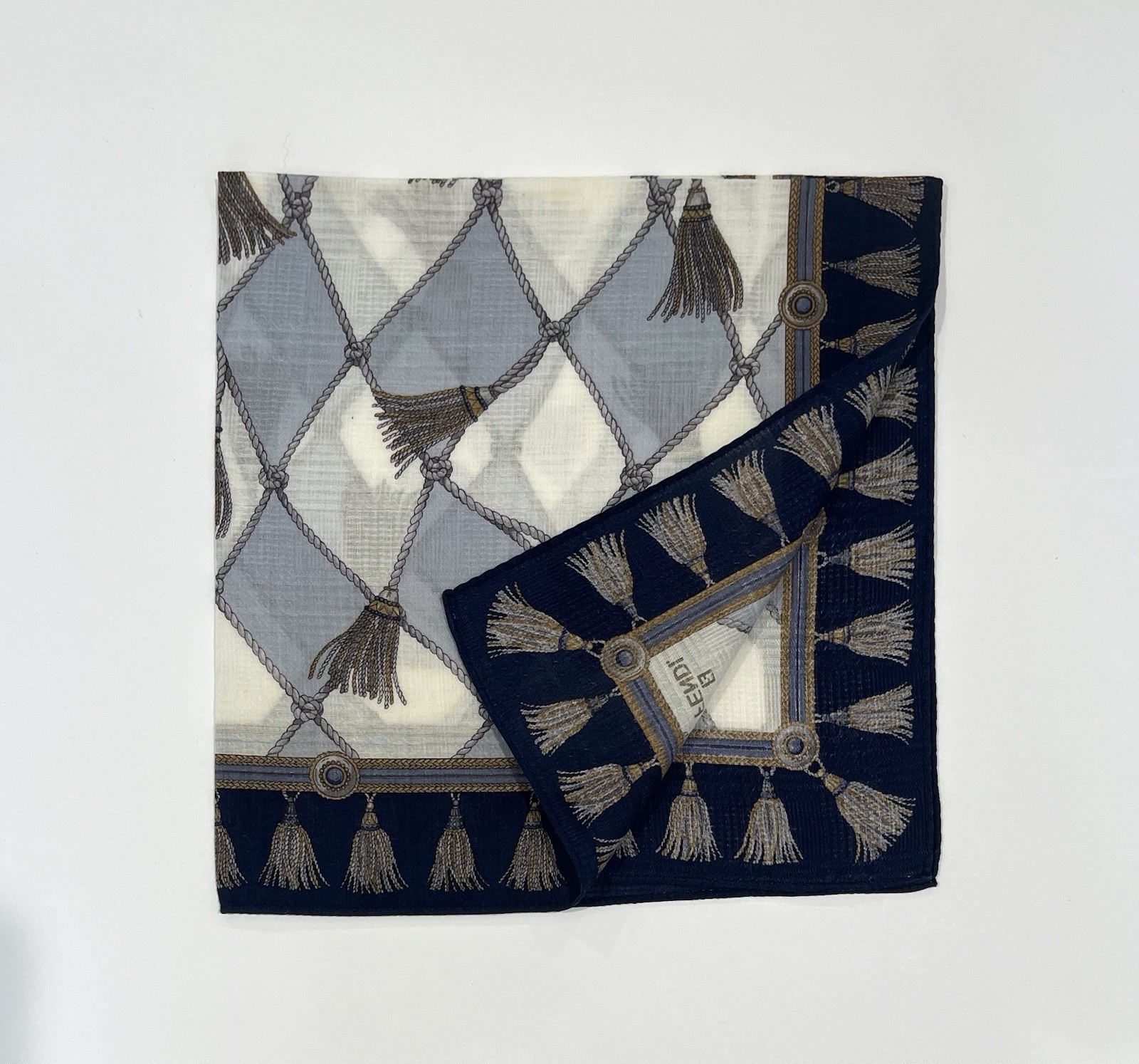 FENDI Handkerchief Vintage Blue Cotton Art Logo Plaid Plain Pocket Square 19