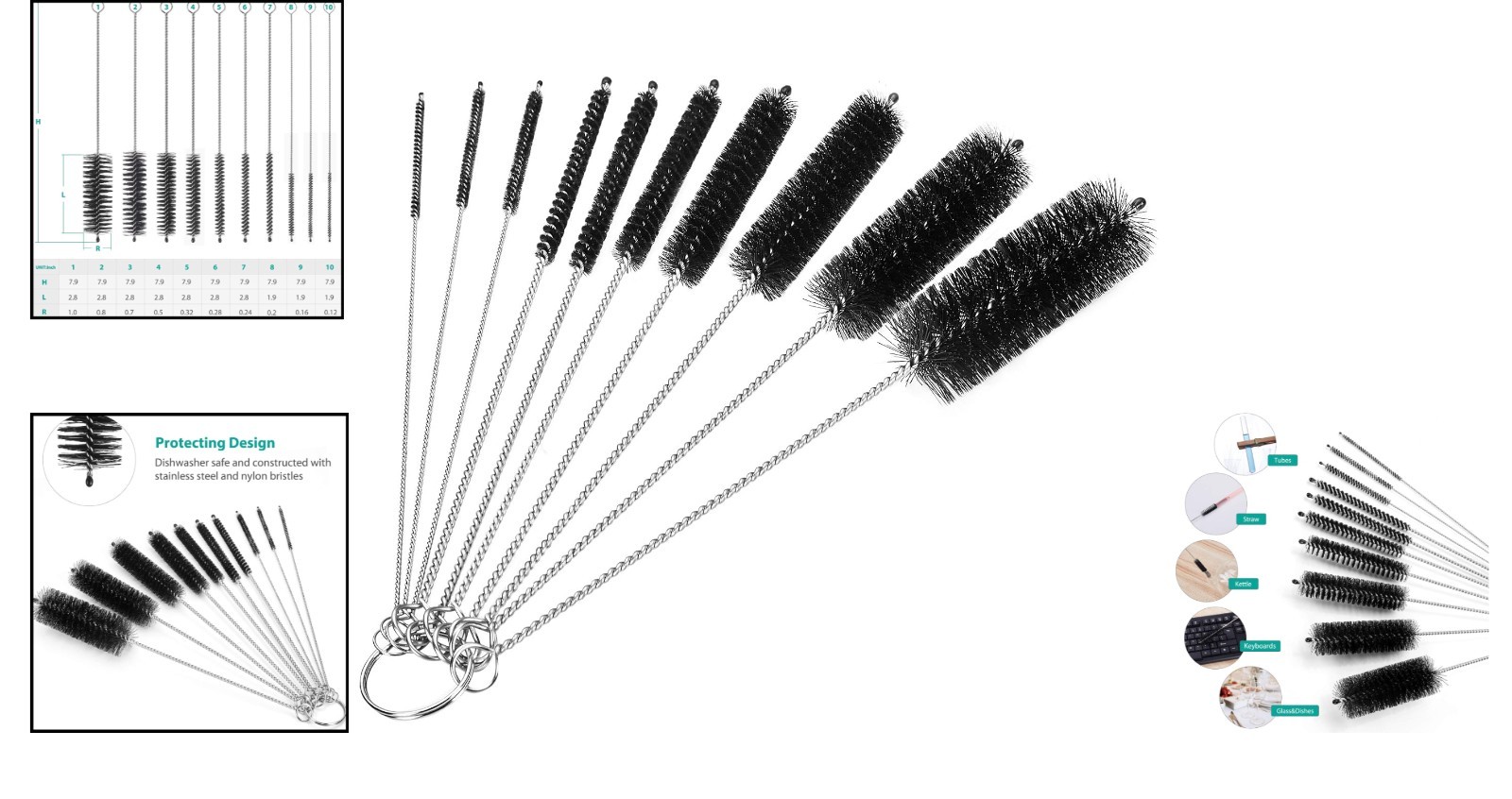 Особенности: Flexibile, Hanging Hook, Keychain, Multiple Sizes, Portable, Bottle Cleaning Brush, Glass Cleaning Brush, Straws Cleaning Brush, Pipe Cleaning Brush, Gun Cleaning Brush, Coffee Cleaning Brush, Feeding Tube Cleaning Brush, Flexible Brush, Flexible Wire Brush