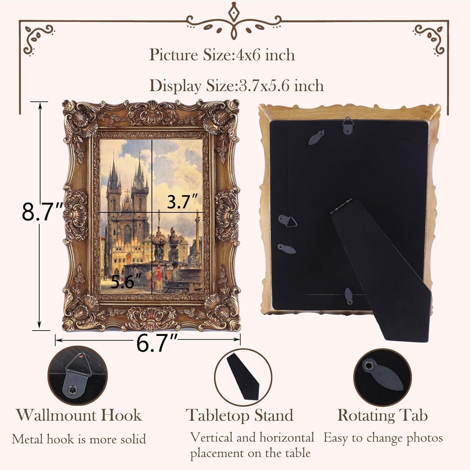 SIKOO 4x6 Vintage Picture Frame Antique Ornate Bronze Gold Photo Frame with Glas