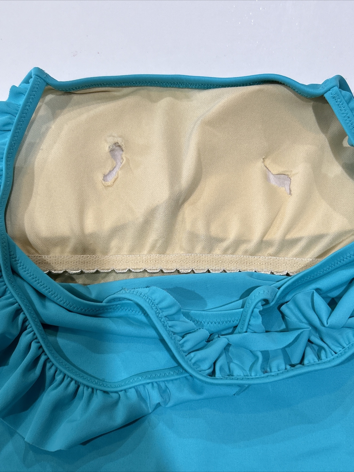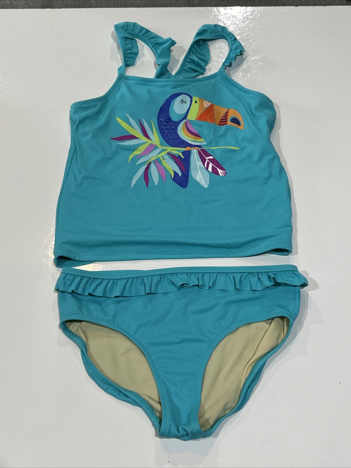 Lands' End Girls 14 Blue Stripe Two Piece Tankini Swimsuit Ruffle Edge Toucan