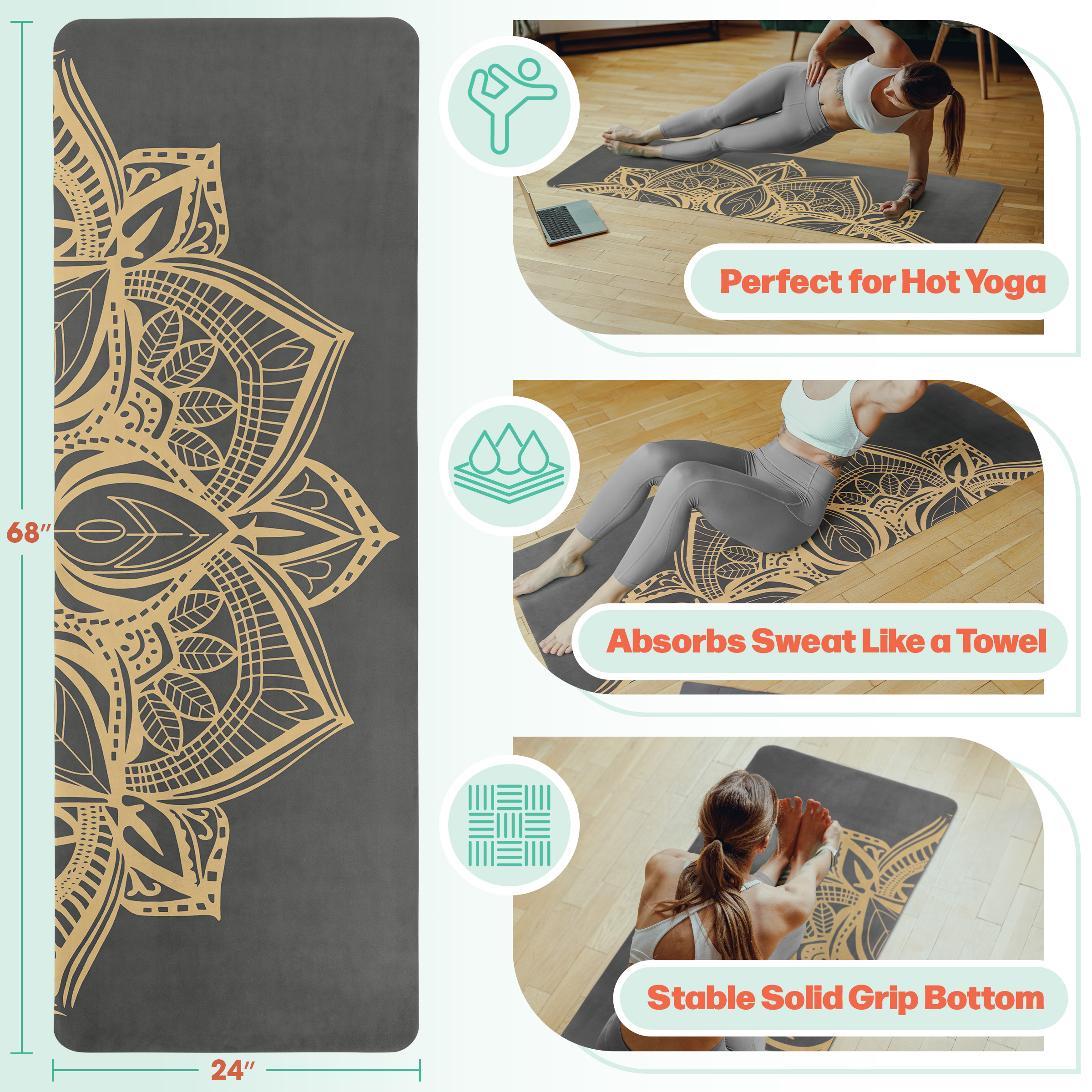 Yoga Mat with Strap Sweat Absorbent Exercise Mat Non Slip Fitness Floor Mat