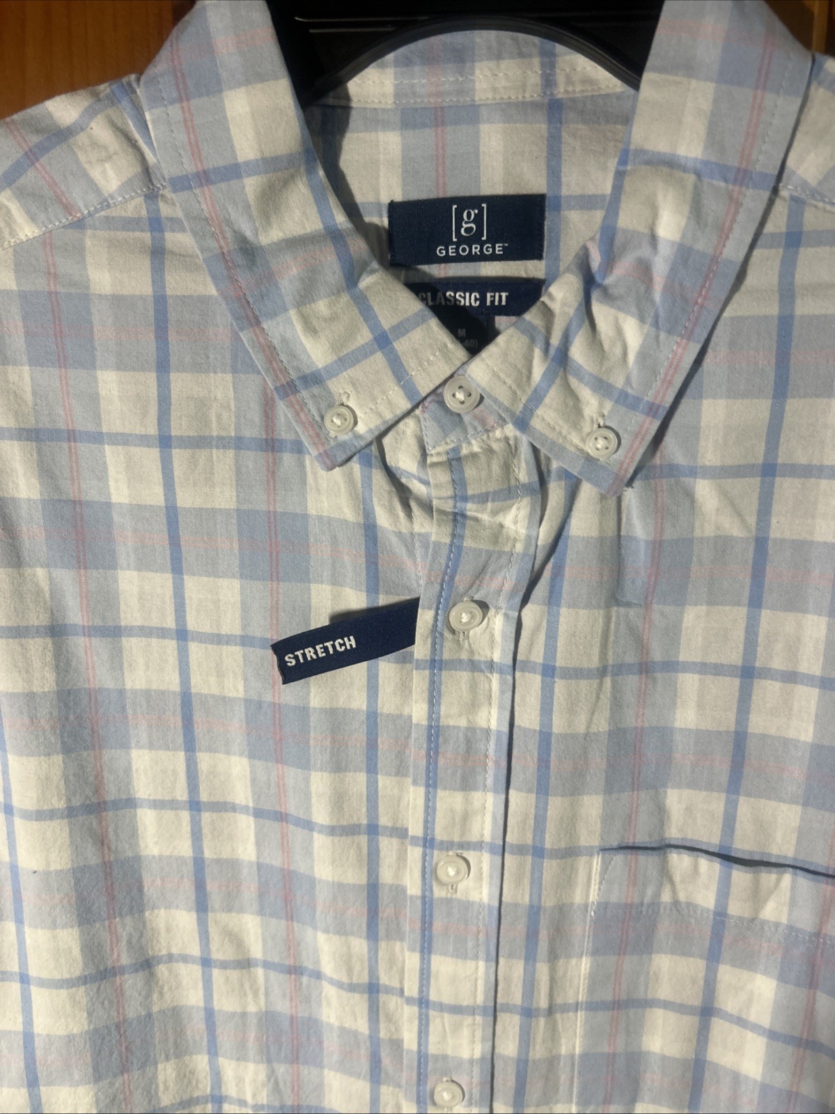 NWT George Men s 38-40 Blue Pink Plaid Classic Fit Short Sleeve Poplin Shirt