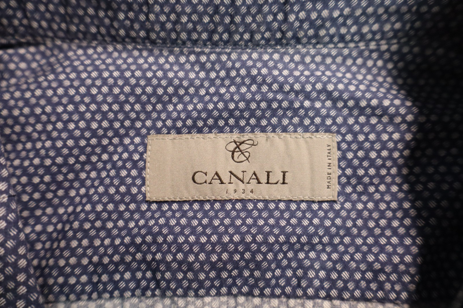 Mens Canali Button Front Dress Shirt Size 17 1/2 Blue White Geometric Made in It