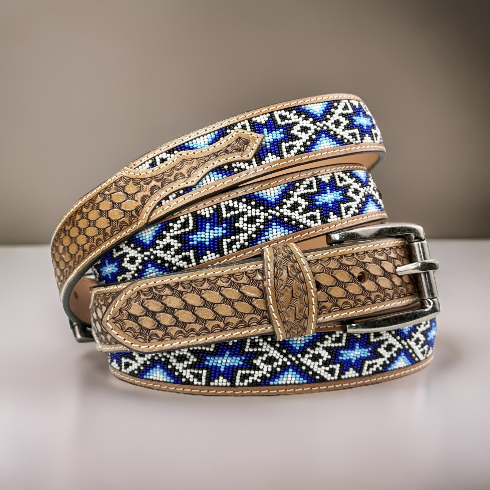 Full Grain Leather Hand Tooled Western Belt Cowboy Rodeo Beaded Removable Buckle