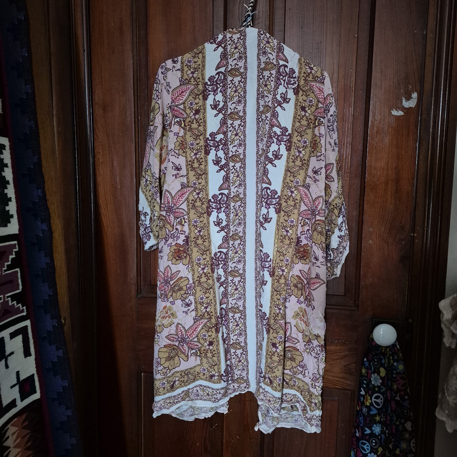 как выглядит Angie Floral Bohemian Long Sleeve Rayon Kimono Tunic M Pink Brown Paisley фото