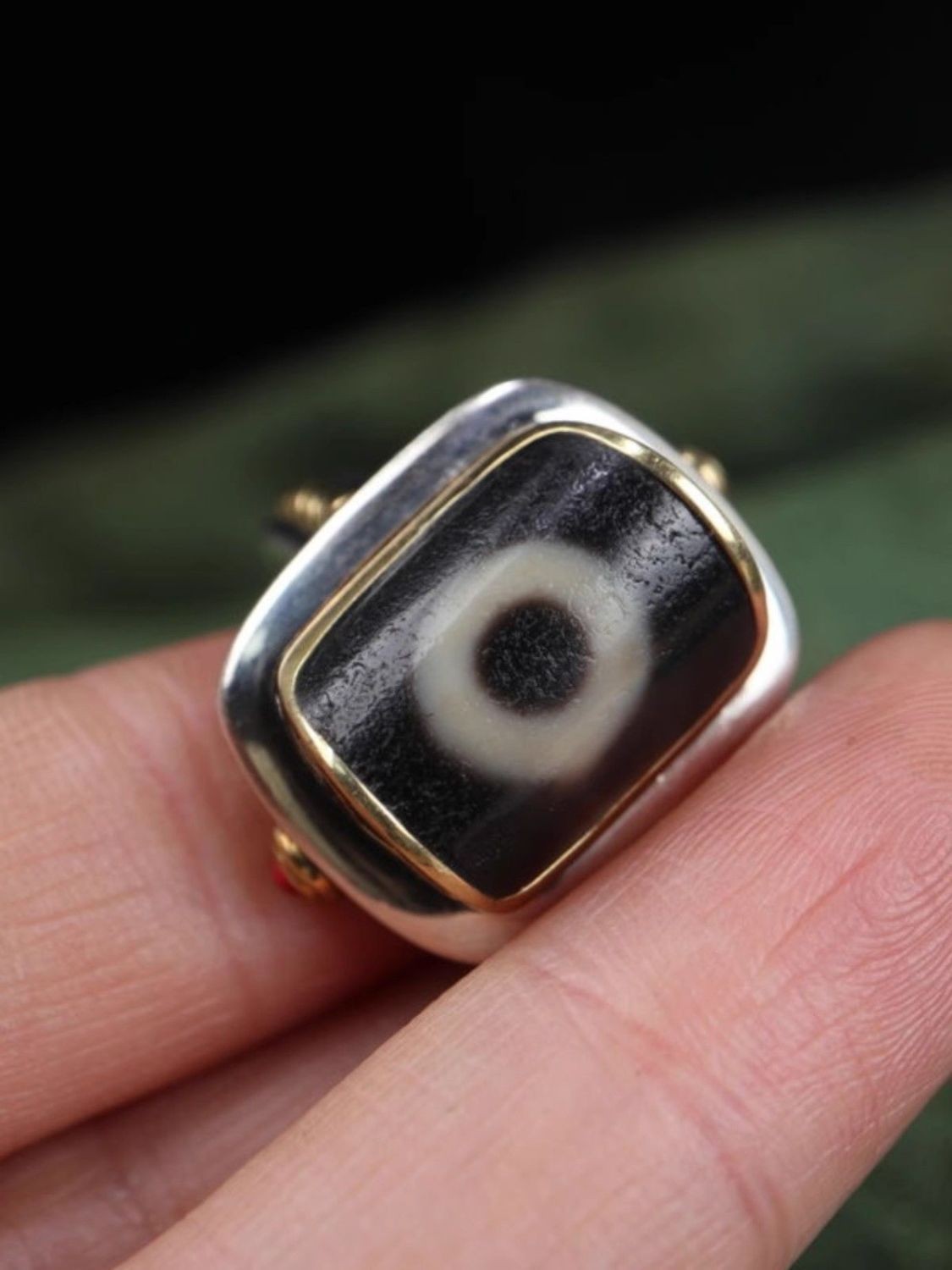 • Silver Plated Tibetan Dzi Bead Ring Inlay Vintage Adjustable Open Ring Unisex