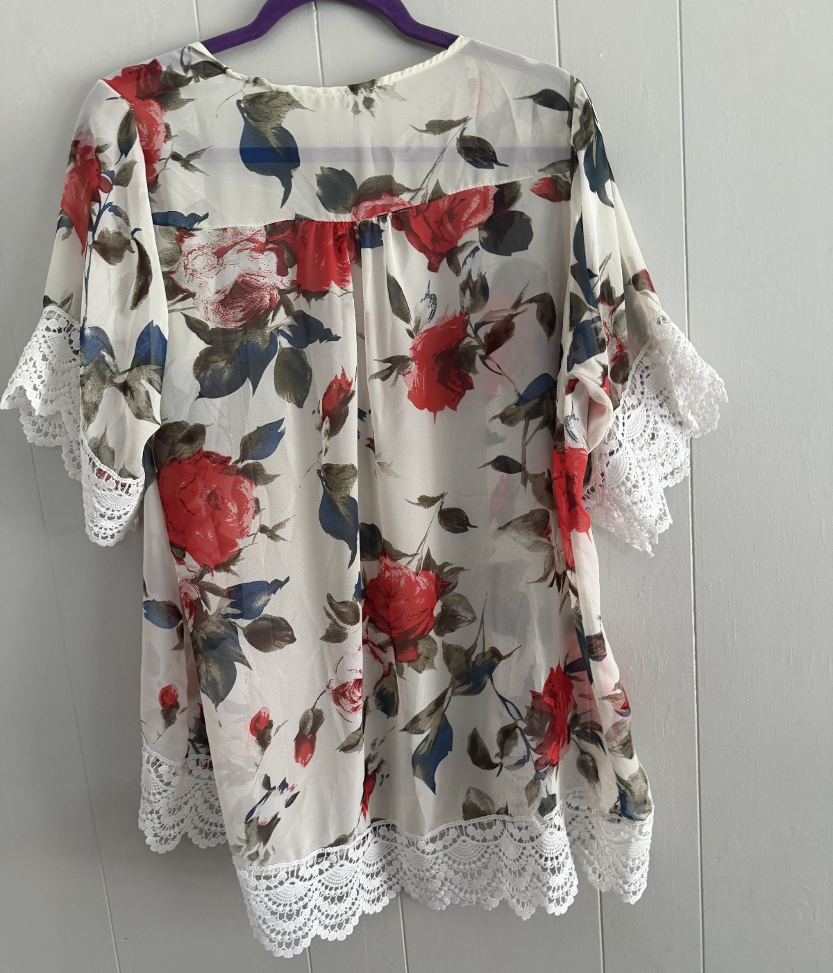 Women s Medium Floral Kimono Cardigan Lace Trim Sheer Open Front