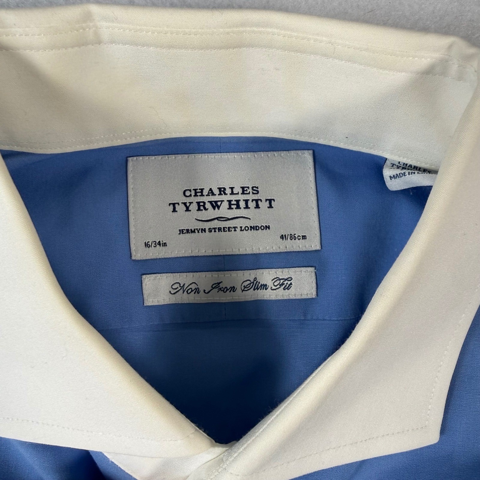 Charles Tyrwhitt Mens Non Iron Slim Fit Dress Shirt Blue White Collar 16 34in