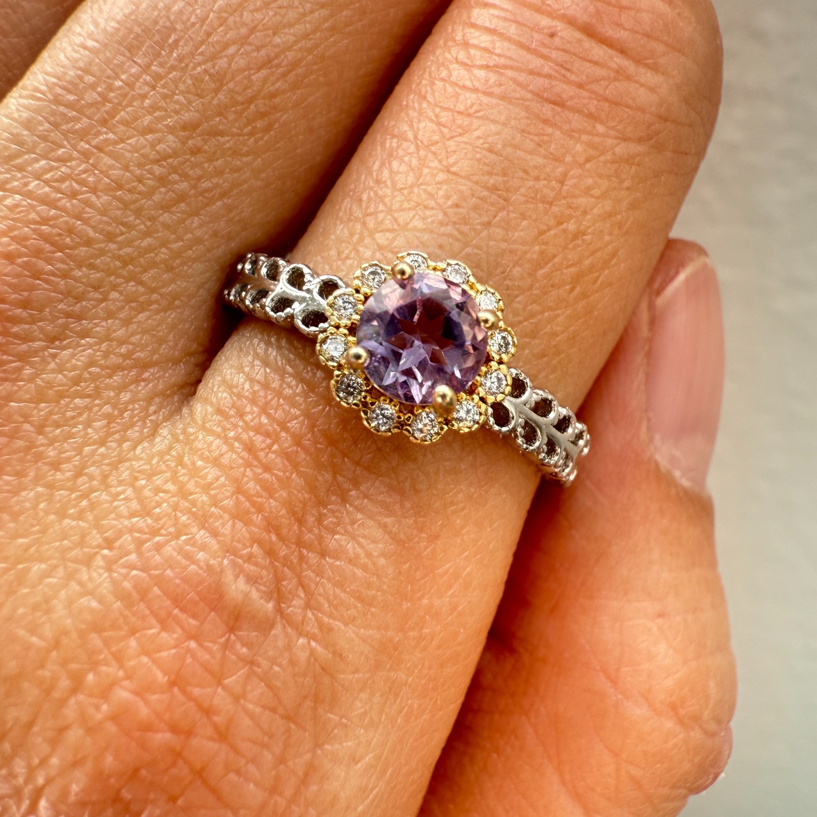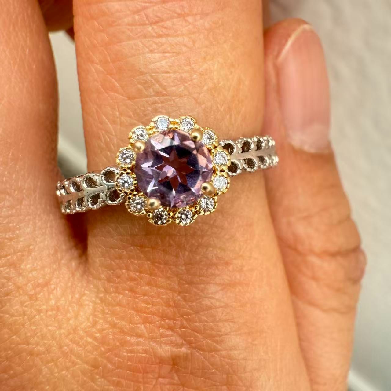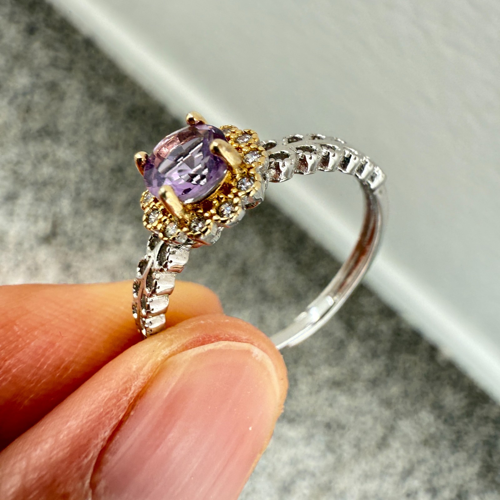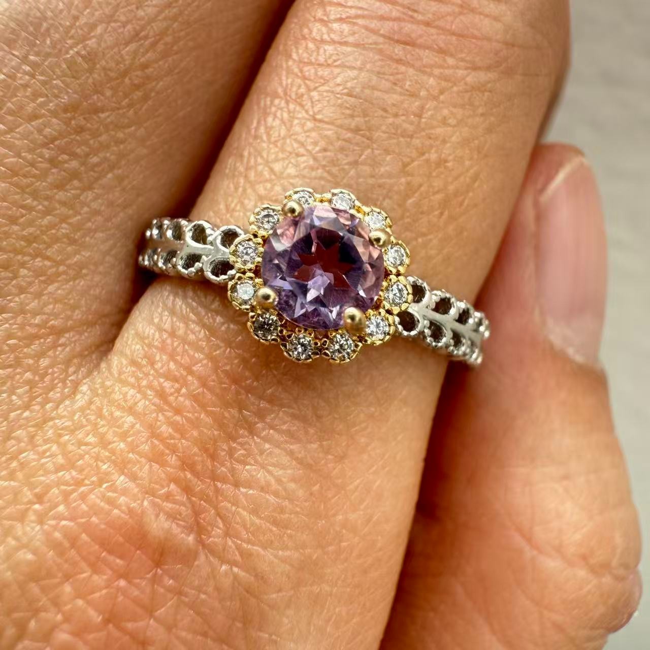 как выглядит 925 Sterling Silver Ring 5mm Natural Purple Amethyst Gemstone Zircon Flower Cute фото