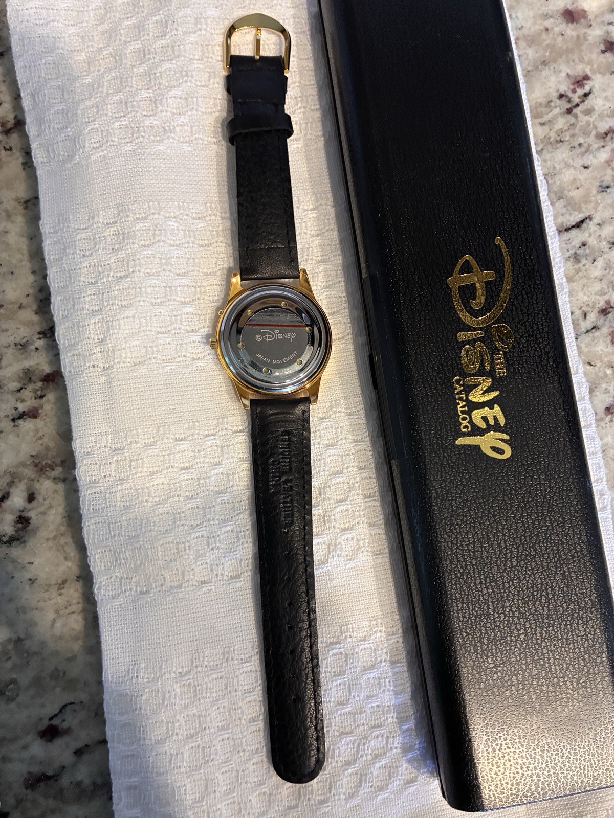 как выглядит Disney Mickey Mouse Gold Tone Wristwatch with Black Leather Band in Original Box фото