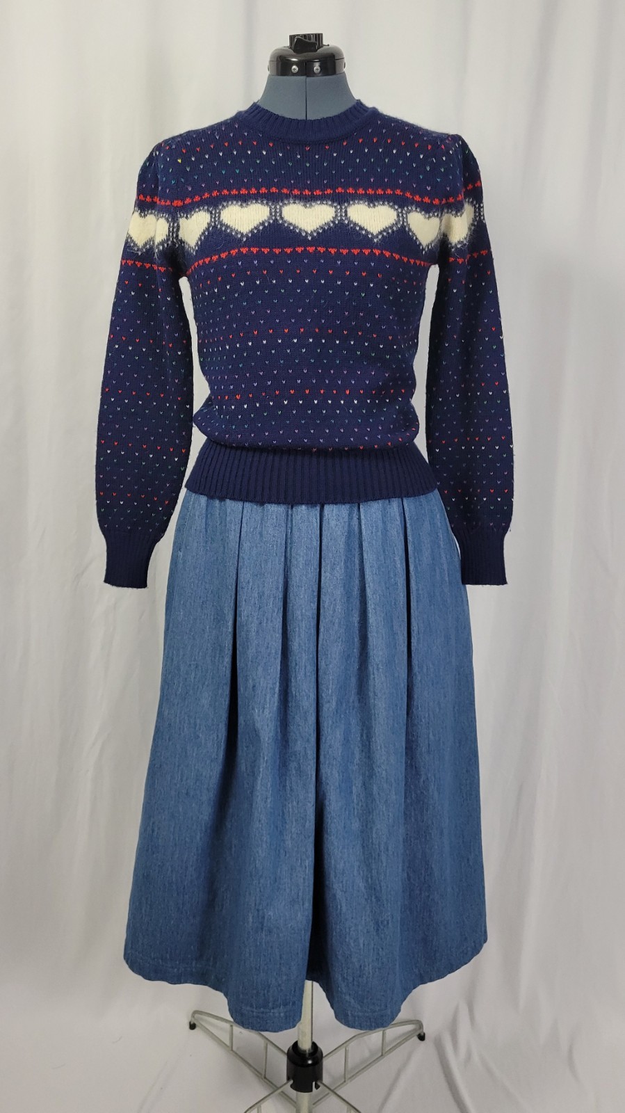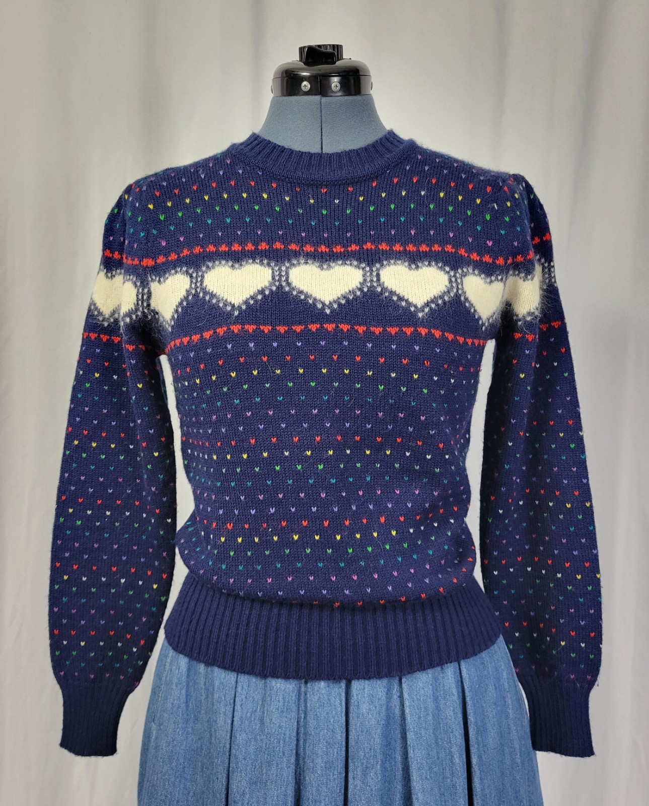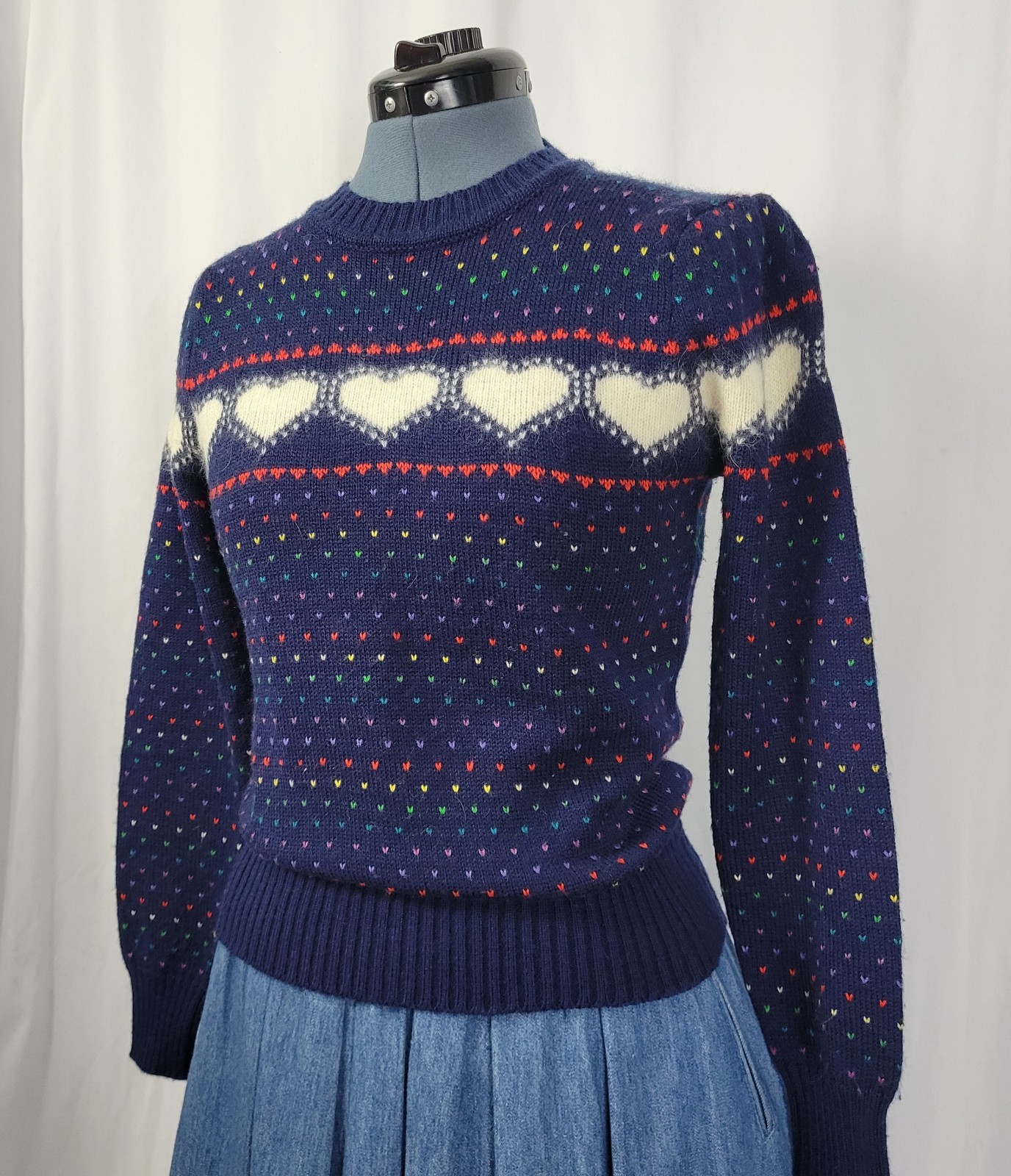 как выглядит Vintage Ricki Navy Blue 1980s Heart Sweater w Shoulder Puffs Size Med фото
