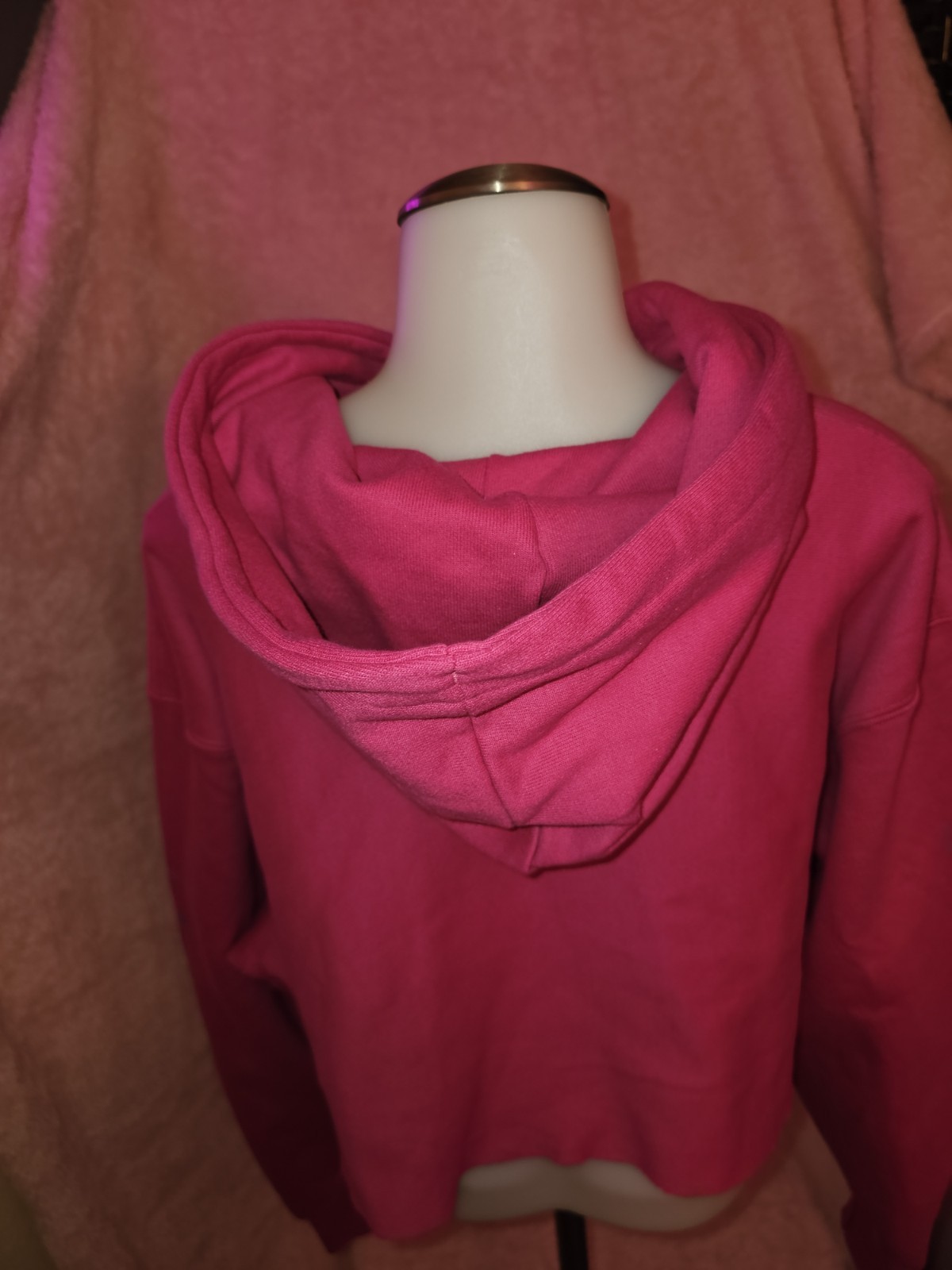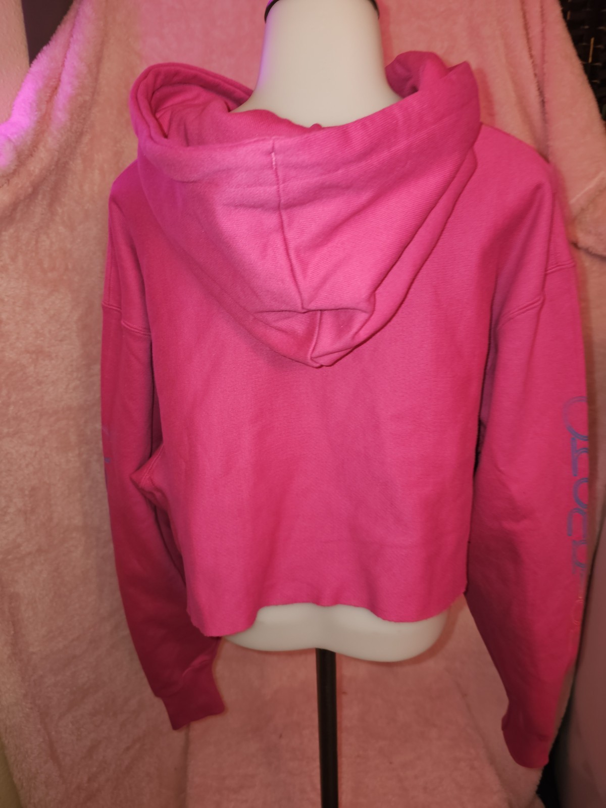 Champion Women's Reverse Weave Cropped Hoodie Pink Spellout Sleeve Logo L