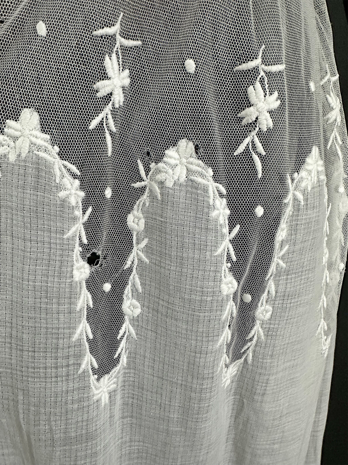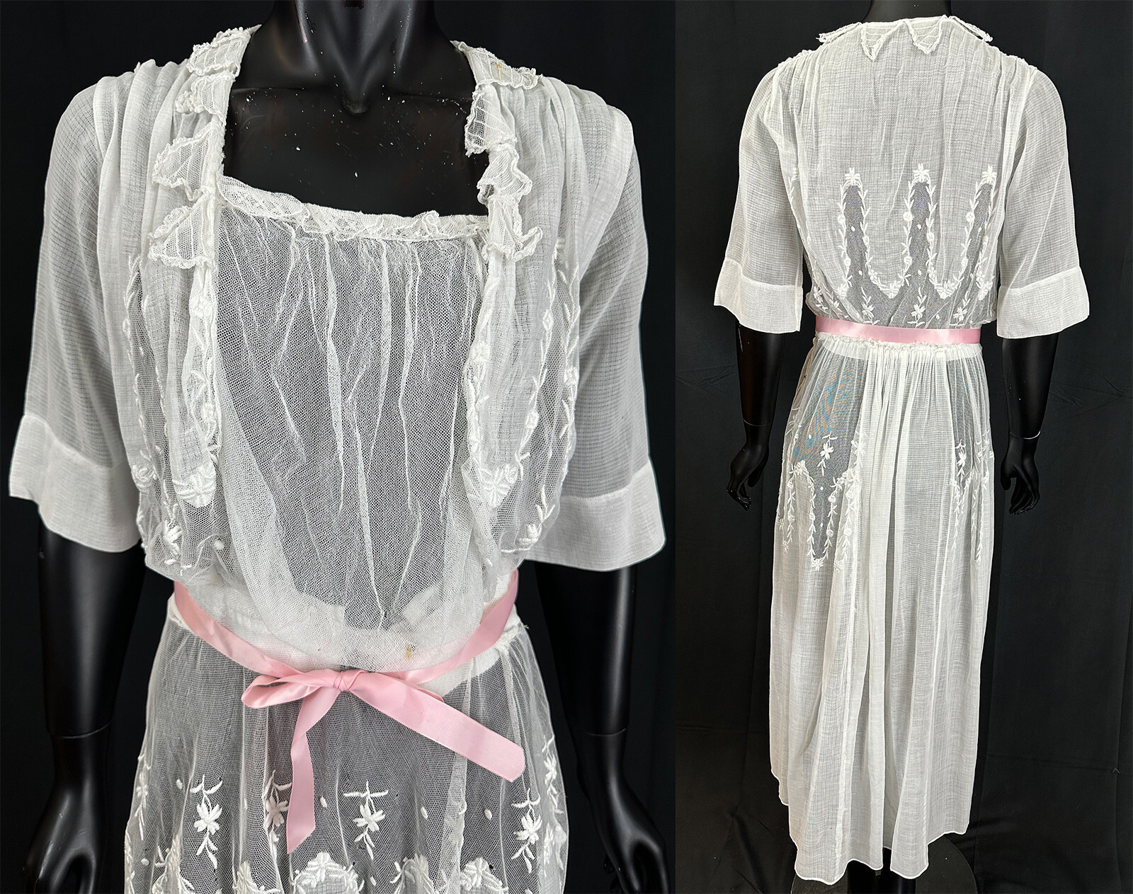 Edwardian Sheer White Net Cotton Batiste Embroidered Pink Ribbon Tea Dress VTG