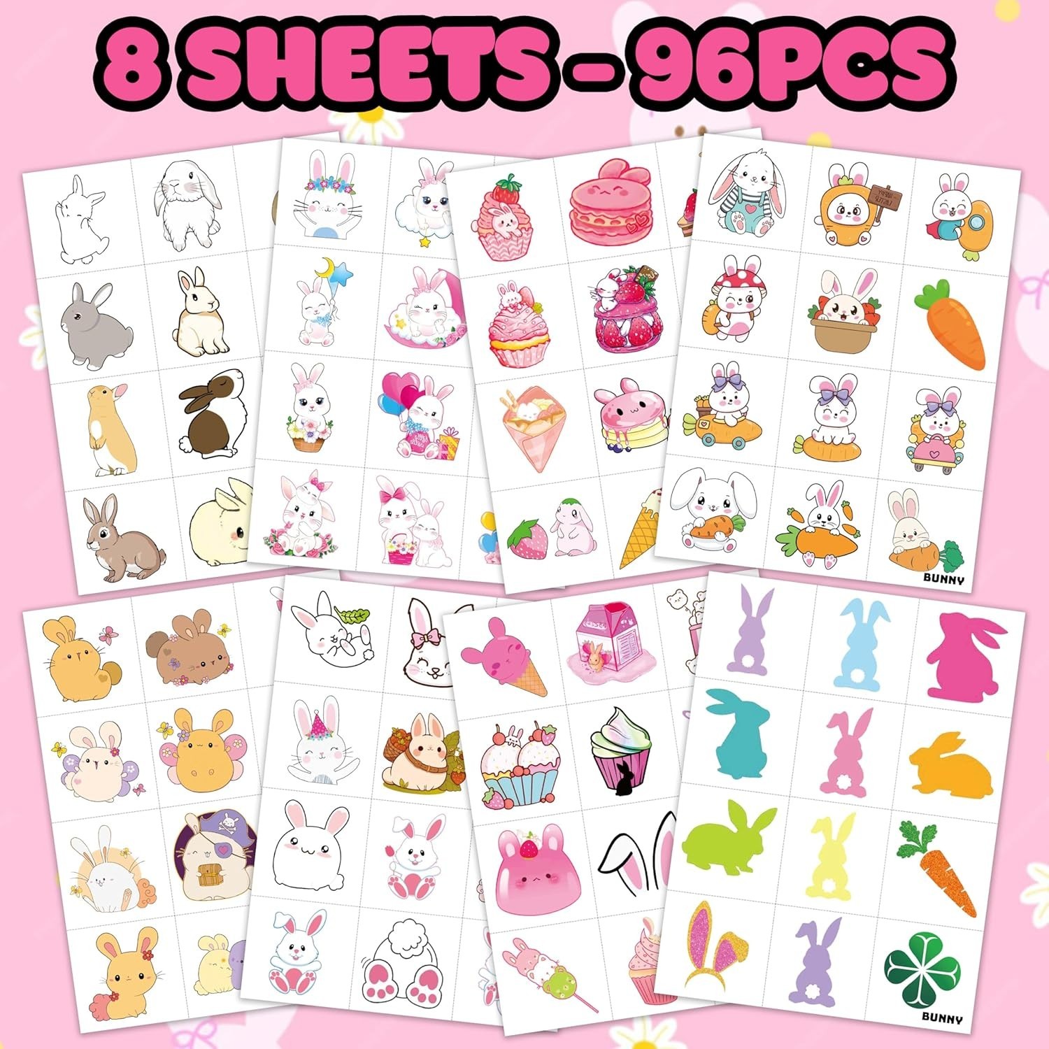 8 Sheets 96PCS Bunny Pre-Cut Temporary Tattoos for Kids Cute Bunny Birthday