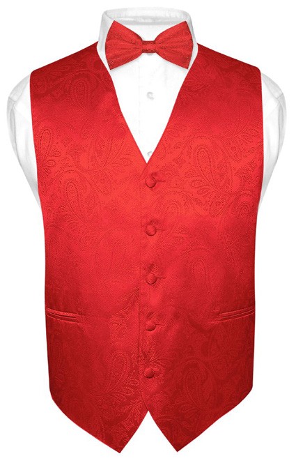 Men's Dress VEST Bow Tie RED Color PAISLEY Design Suit Tuxedo BowTie Hankie Set