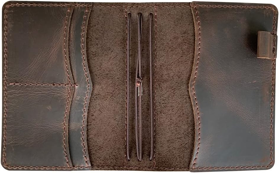 Classic Leather Notebook Cover with Inner Pockets, Dark Brown Elastic Features
