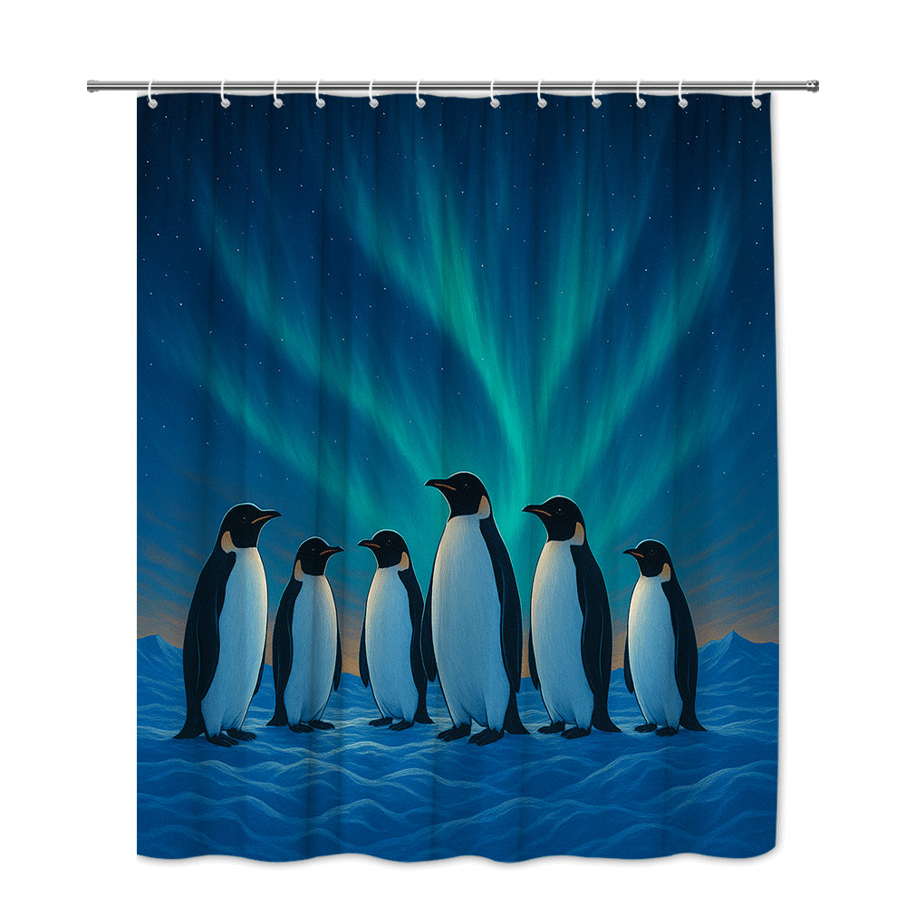 Penguin Shower Curtain with Northern Lights Design