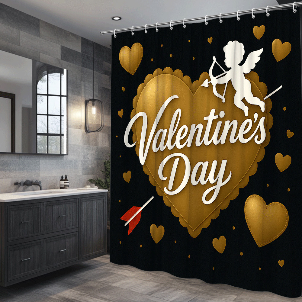 Valentine's Day Shower Curtain with Cupid and Hearts - Black Gold
