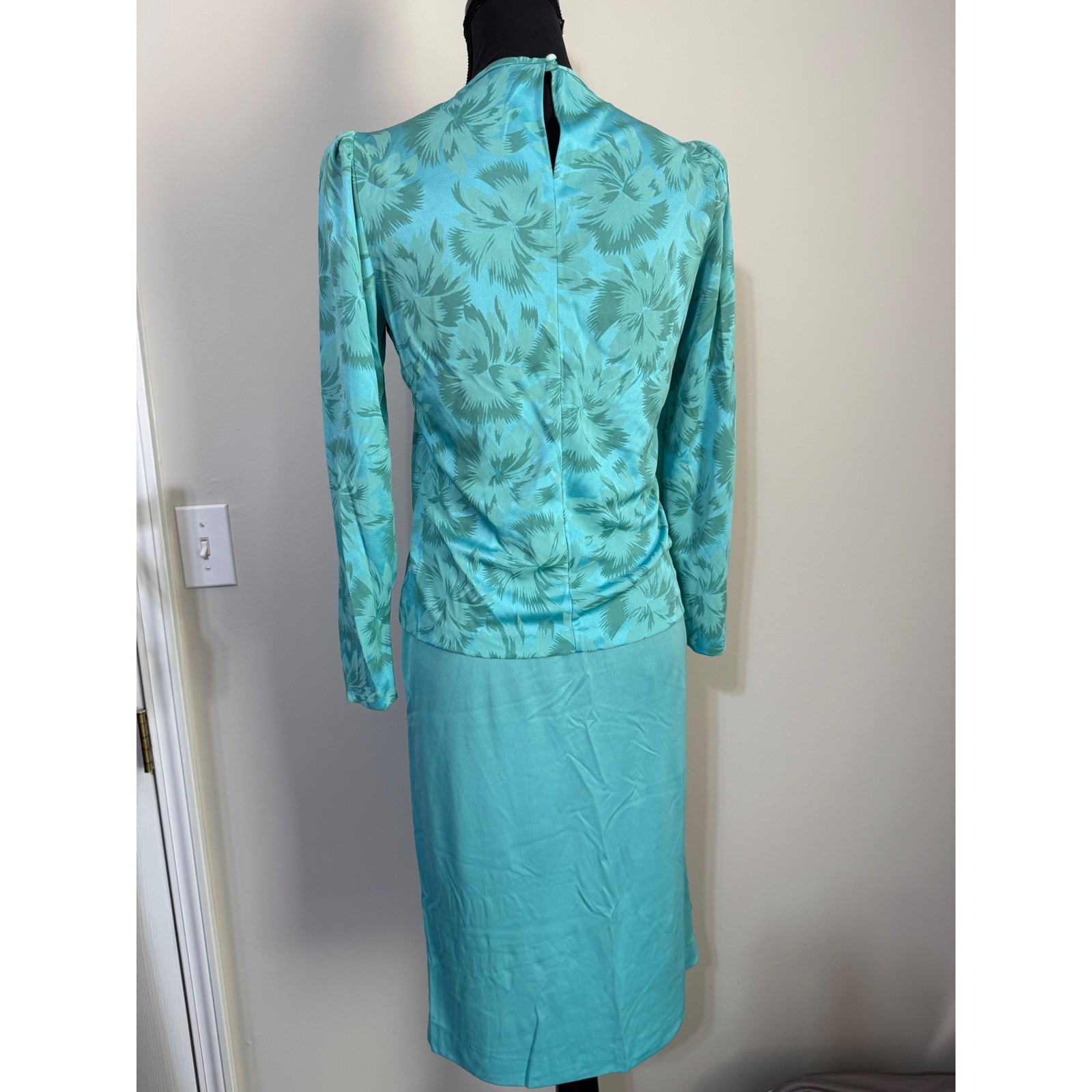 как выглядит Vtg 80s Turquoise Floral Jacquard 2 Piece Skirt Set Long Sleeve Midi Modest фото