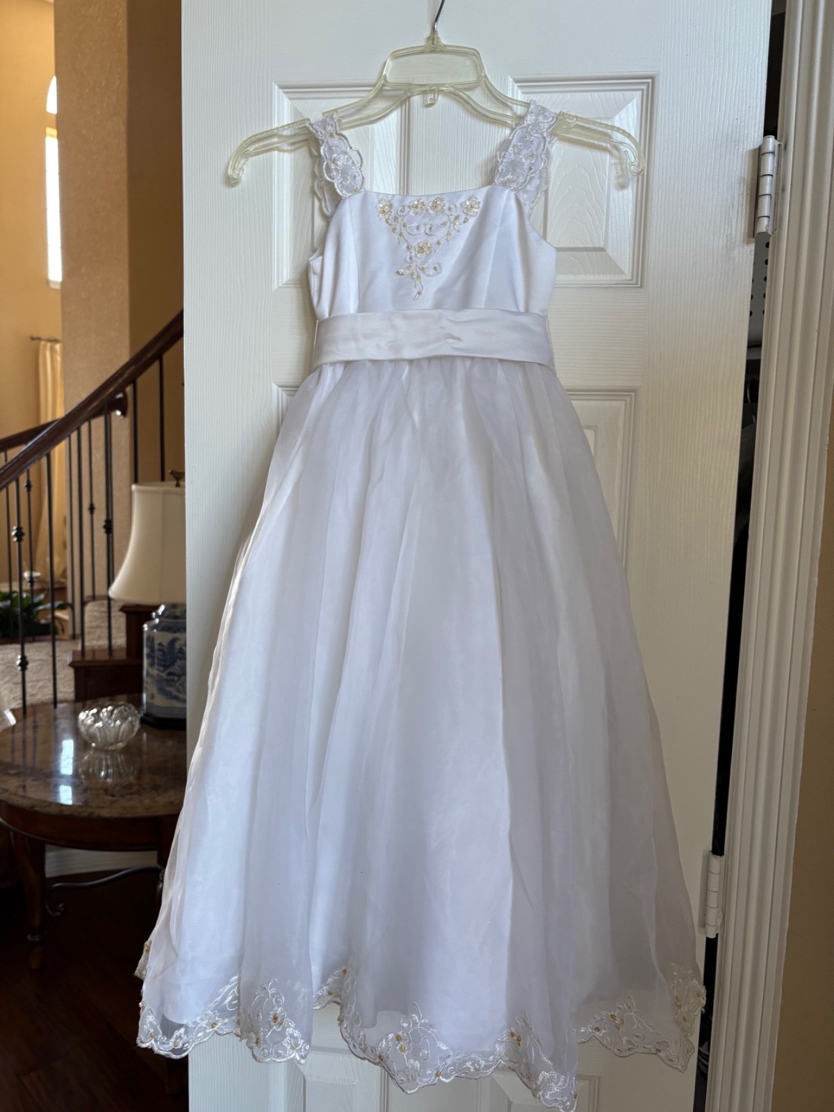 как выглядит Davids Bridal Flower Girl White Gown Dress Size 5 Lace Sequin Pearls w Bow Sash фото