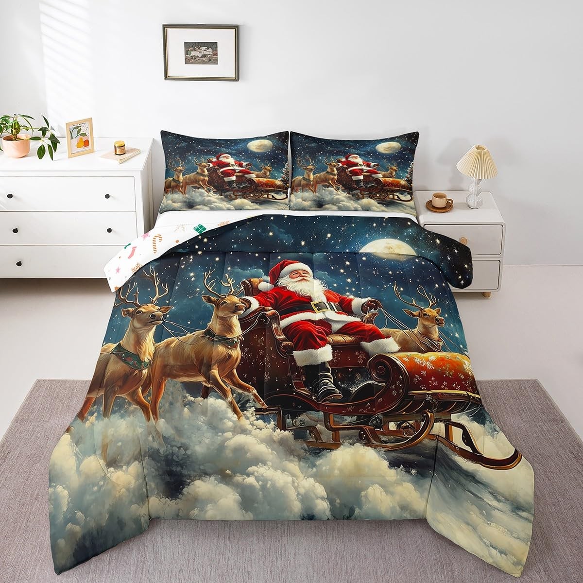Christmas Santa Claus Comforter Set Twin Size 2 Pcs,Cute Reindeer Sled Dreamy...