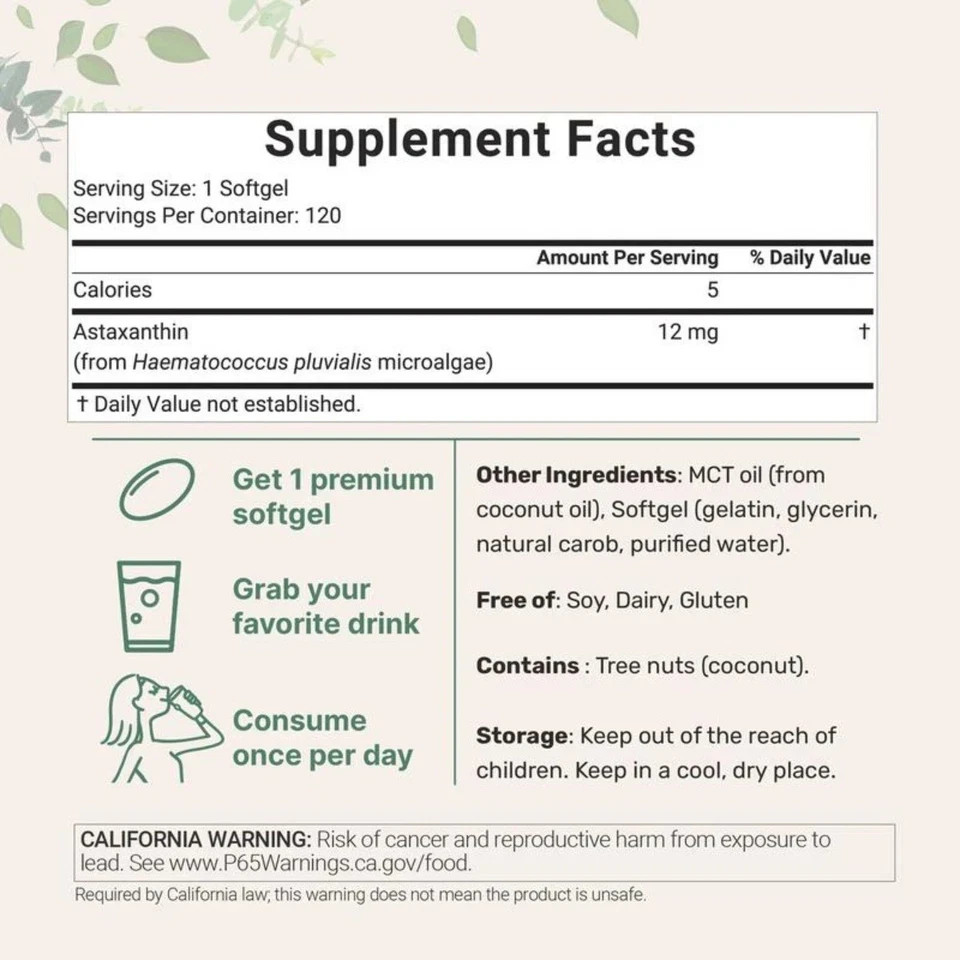 Astaxanthin 12mg Antioxidant Supplements Fresh Microalgae Eye Joint Skin Health