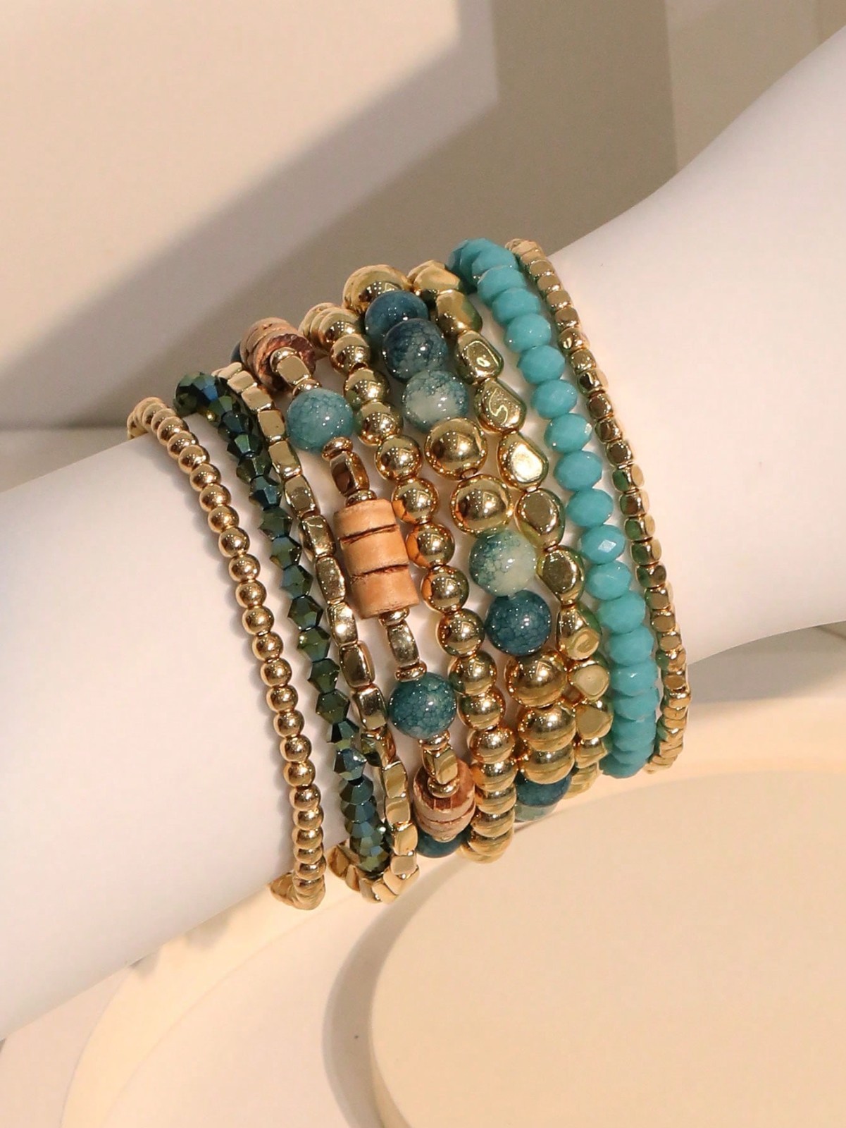 9pcs Boho Beaded Colorful Blue Bracelets Set For Women, Suitable For Vacation