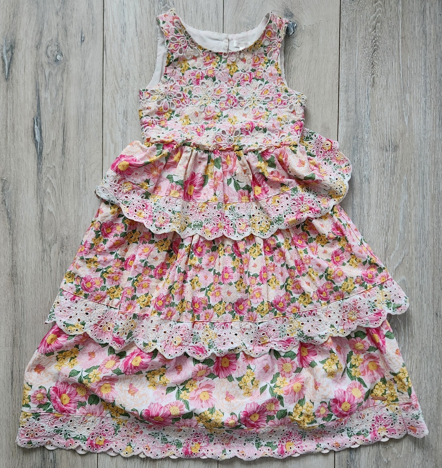 TAHARI Girl's Long Sleeveless Tiered Dress Vibrant Floral Pink Yellow Size 5