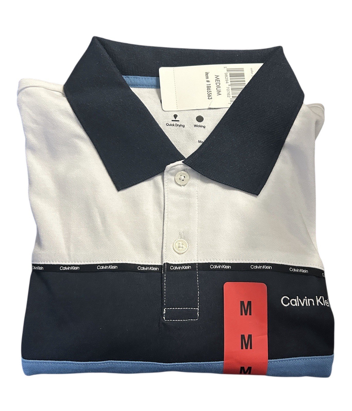 Calvin Klein Polo Shirt, M, White Blue, Quick Dry Wicking Split Hem Short Sleeve