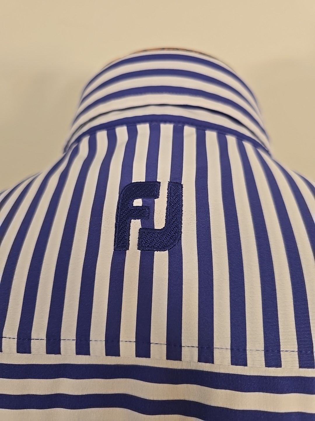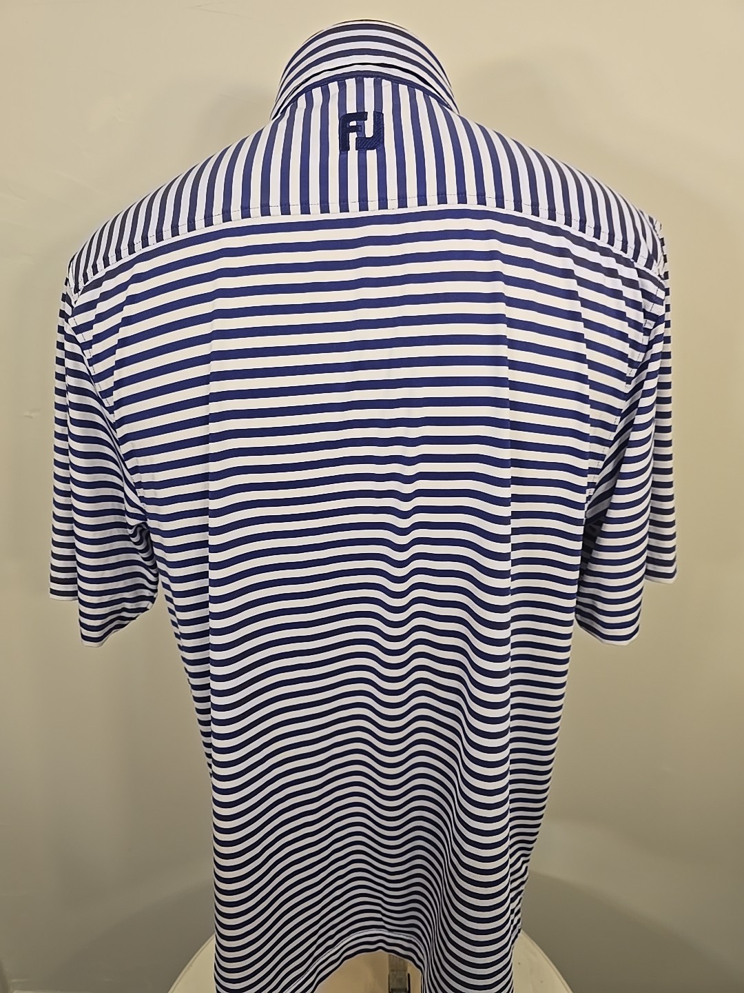 как выглядит Footjoy Mens Medium Blue White Striped Short Sleeve Golf Polo Shirt фото