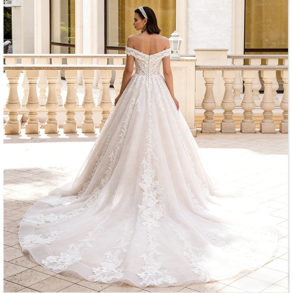 Luxury Champagne Ball Gown Lace Appliques Off the Shoulder Wedding Dresses Back