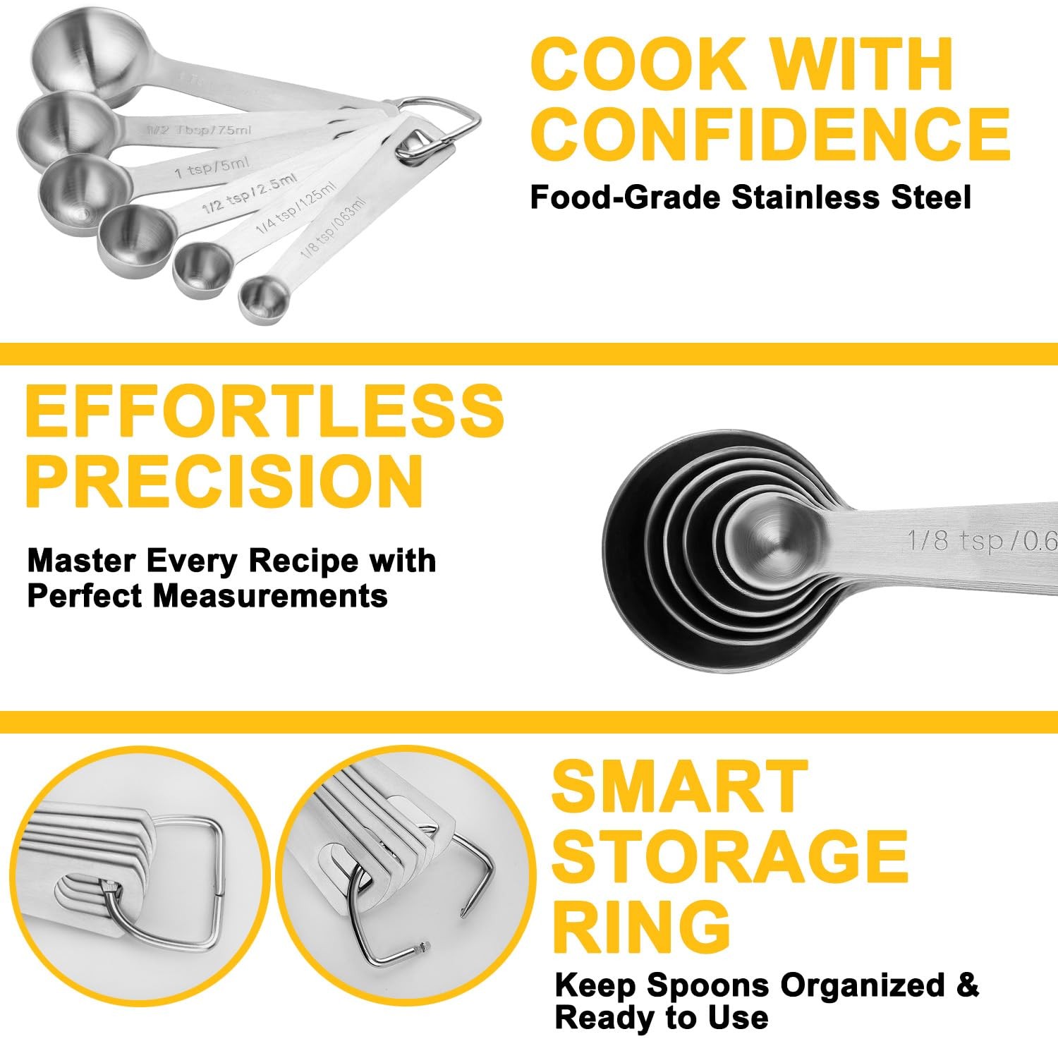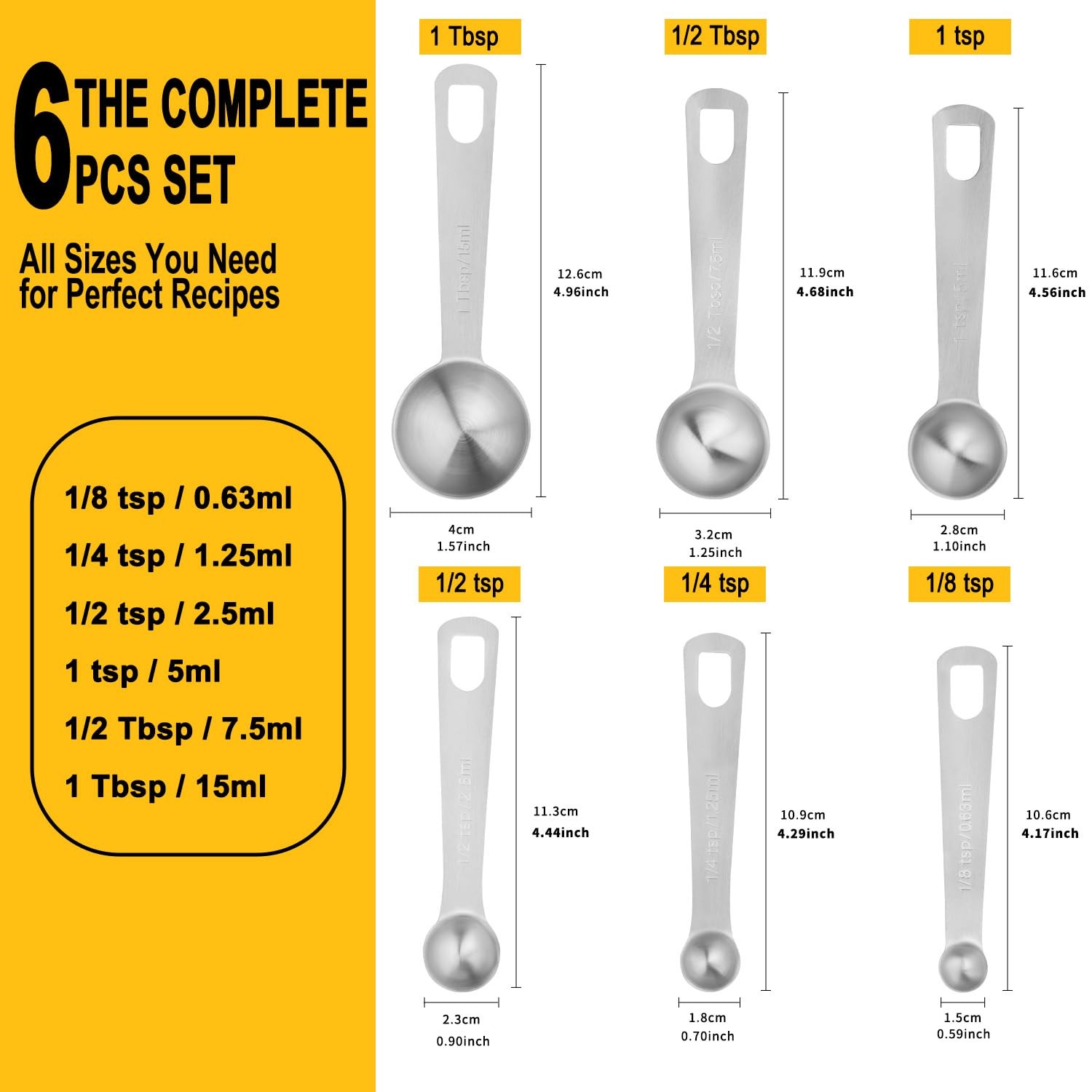 Included Components: 1/8, 1/4, 1/2 , 1 Tsp, 1/2, 1 Tbsp
