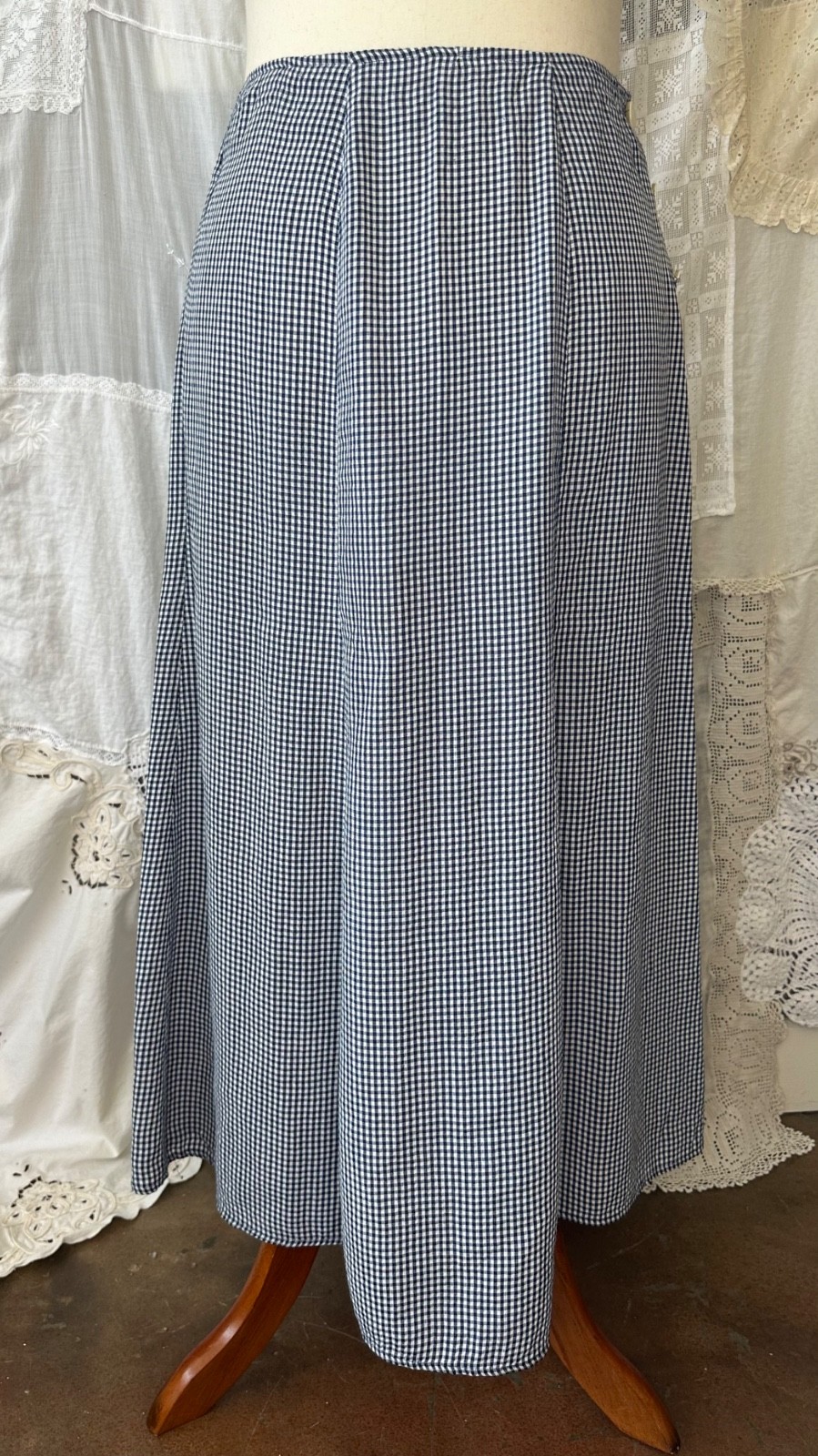 как выглядит Vintage 90s Navy Blue Seersucker Gingham Check Long Bell Prairie Skirt Sz M USA фото