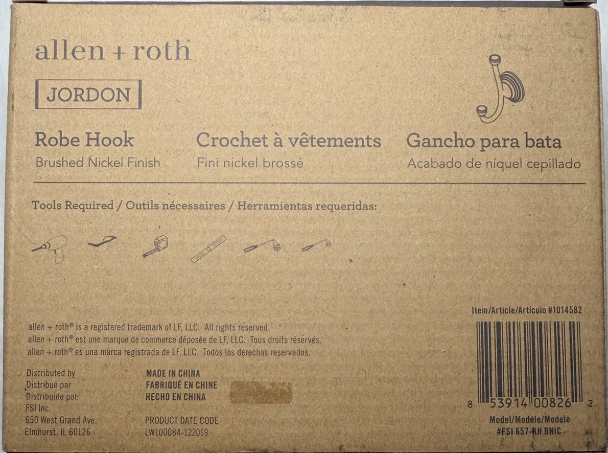 Allen Roth Jordon Double Robe Hook Brushed Nickel Towel Hook 1014582 New
